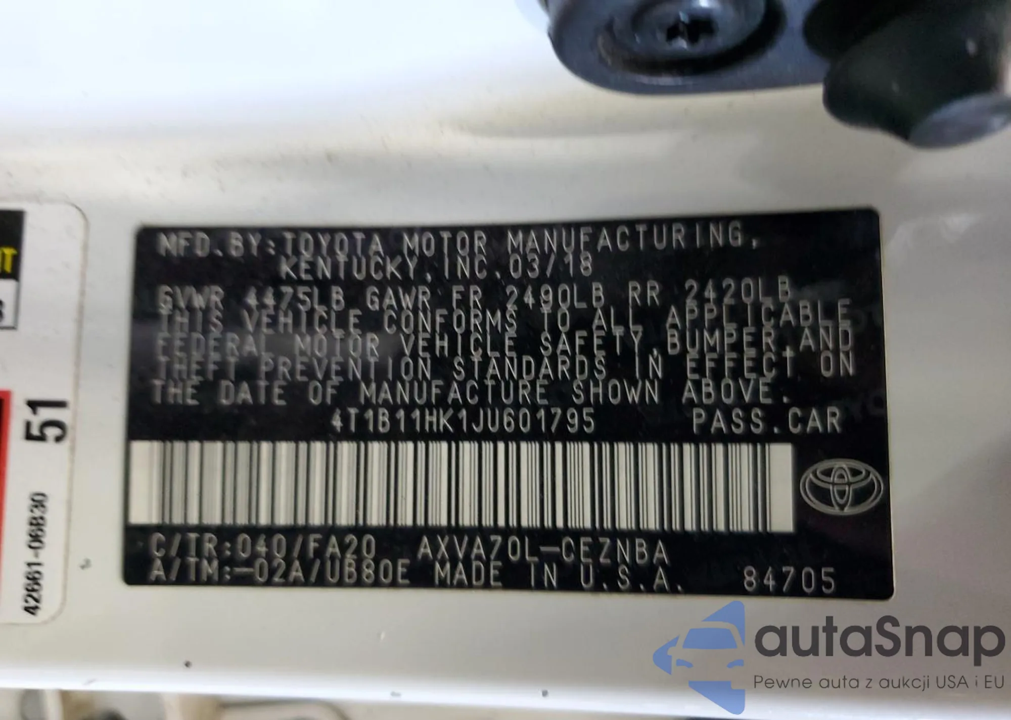 LOT: 68137705 VIN: 4T1B11HK1JU601795
