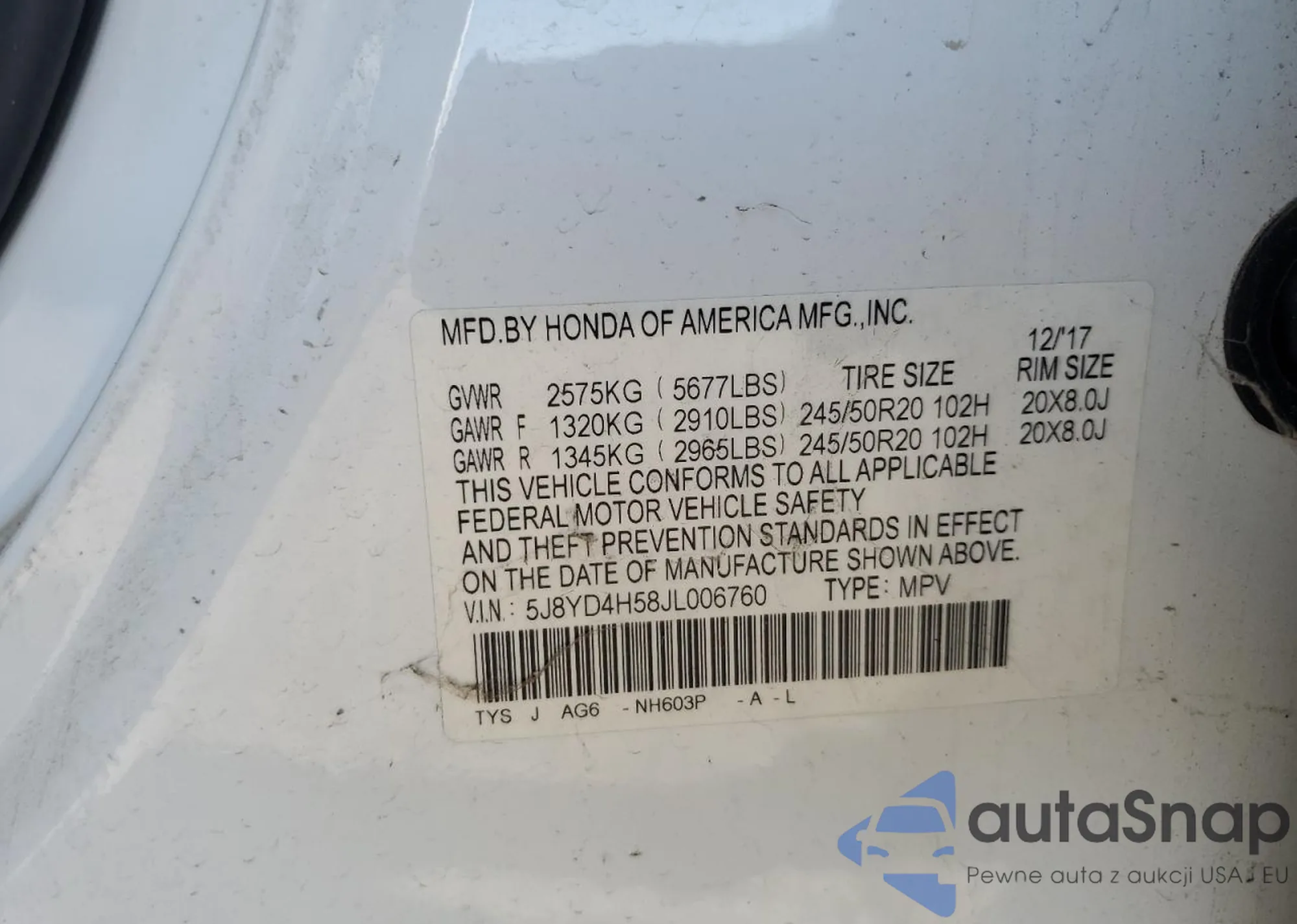 • VIN 5J8YD4H58JL006760