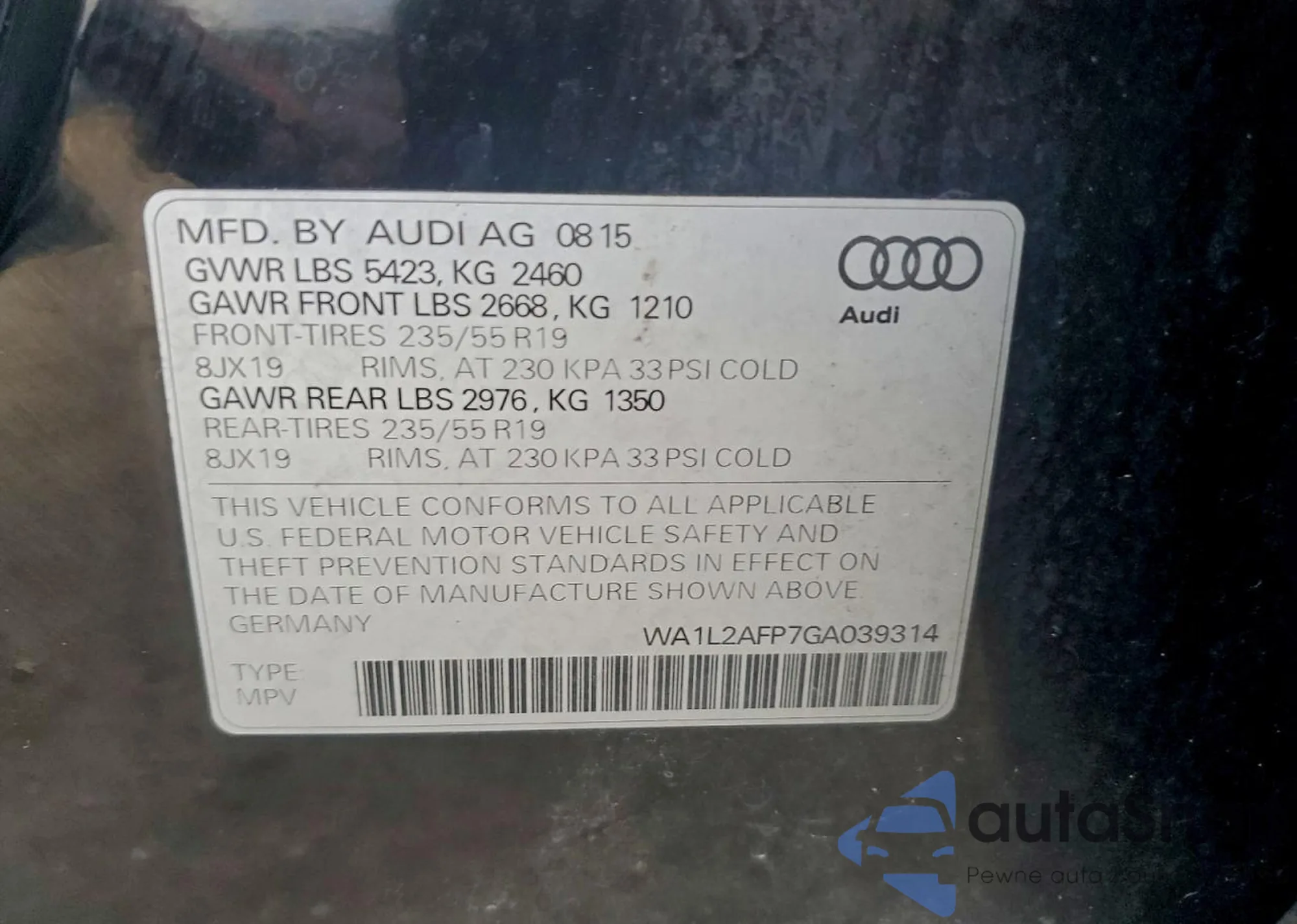 LOT: 97796355 VIN: WA1L2AFP7GA039314