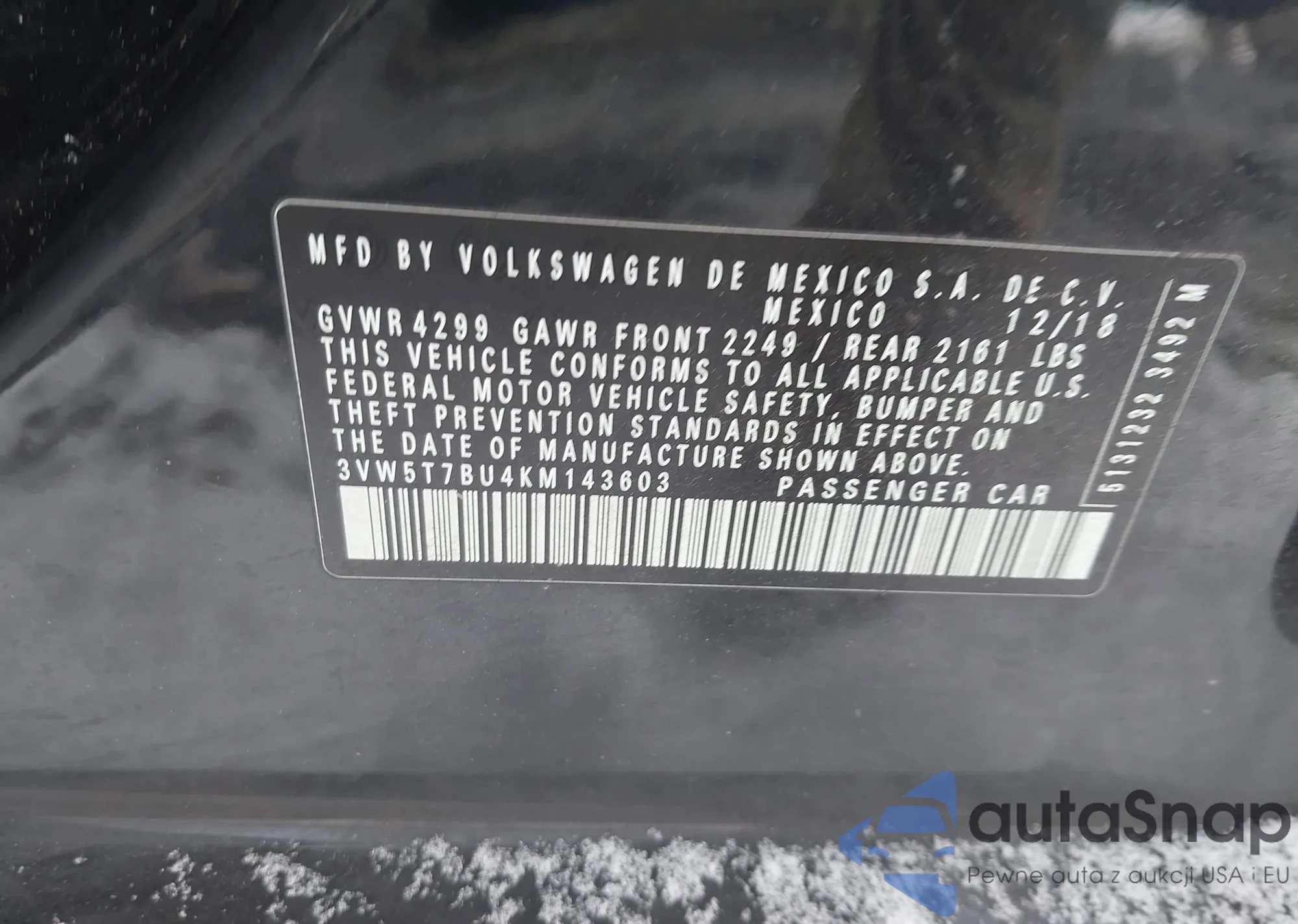 • VIN 3VW5T7BU4KM143603