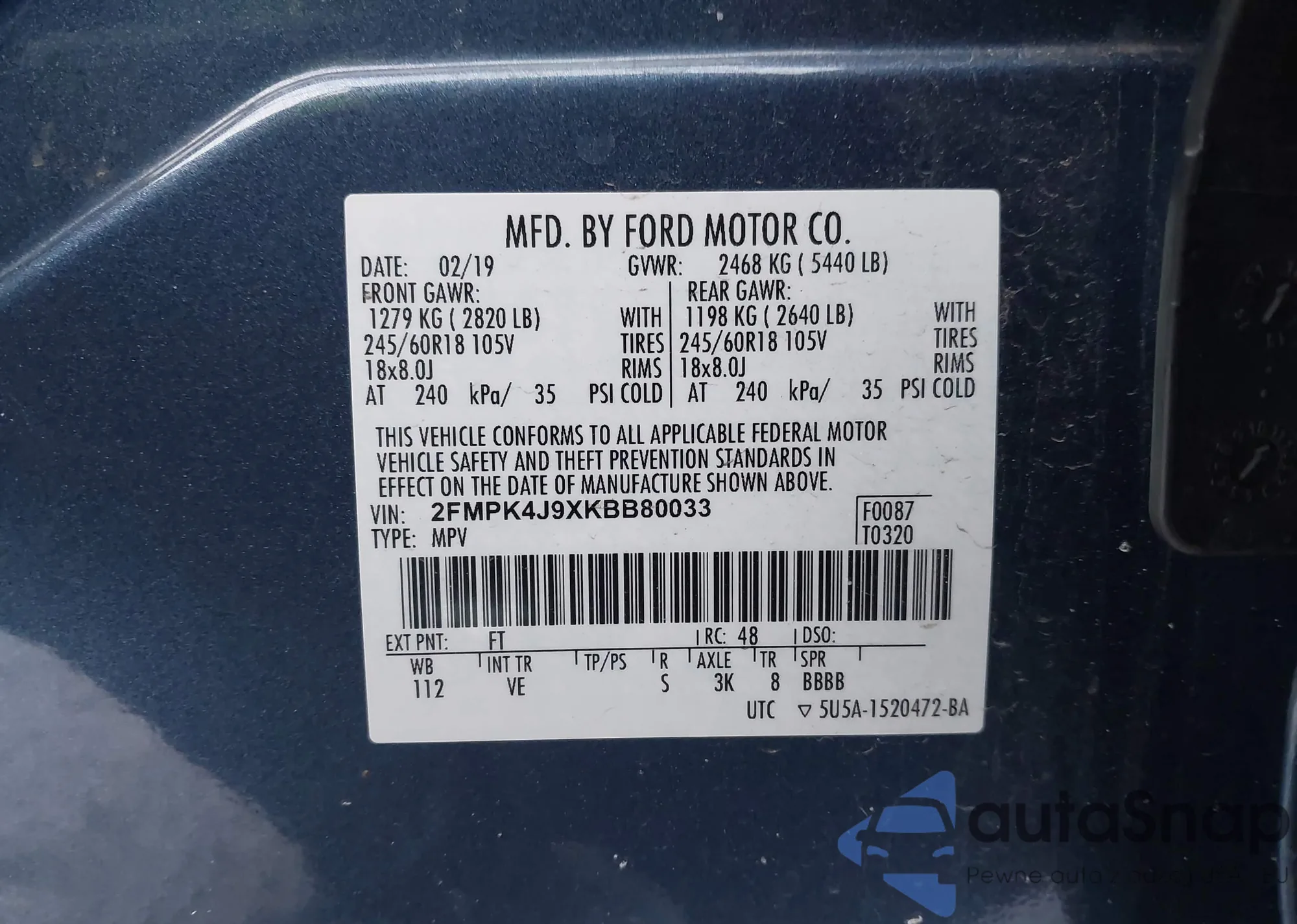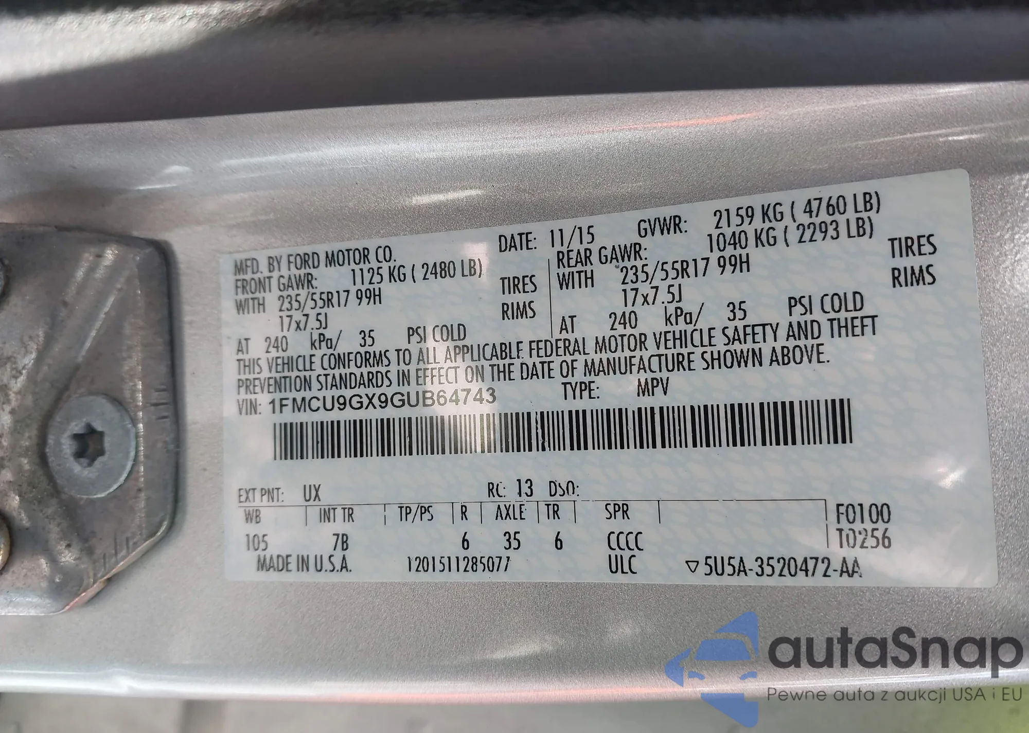 • VIN 1FMCU9GX9GUB64743