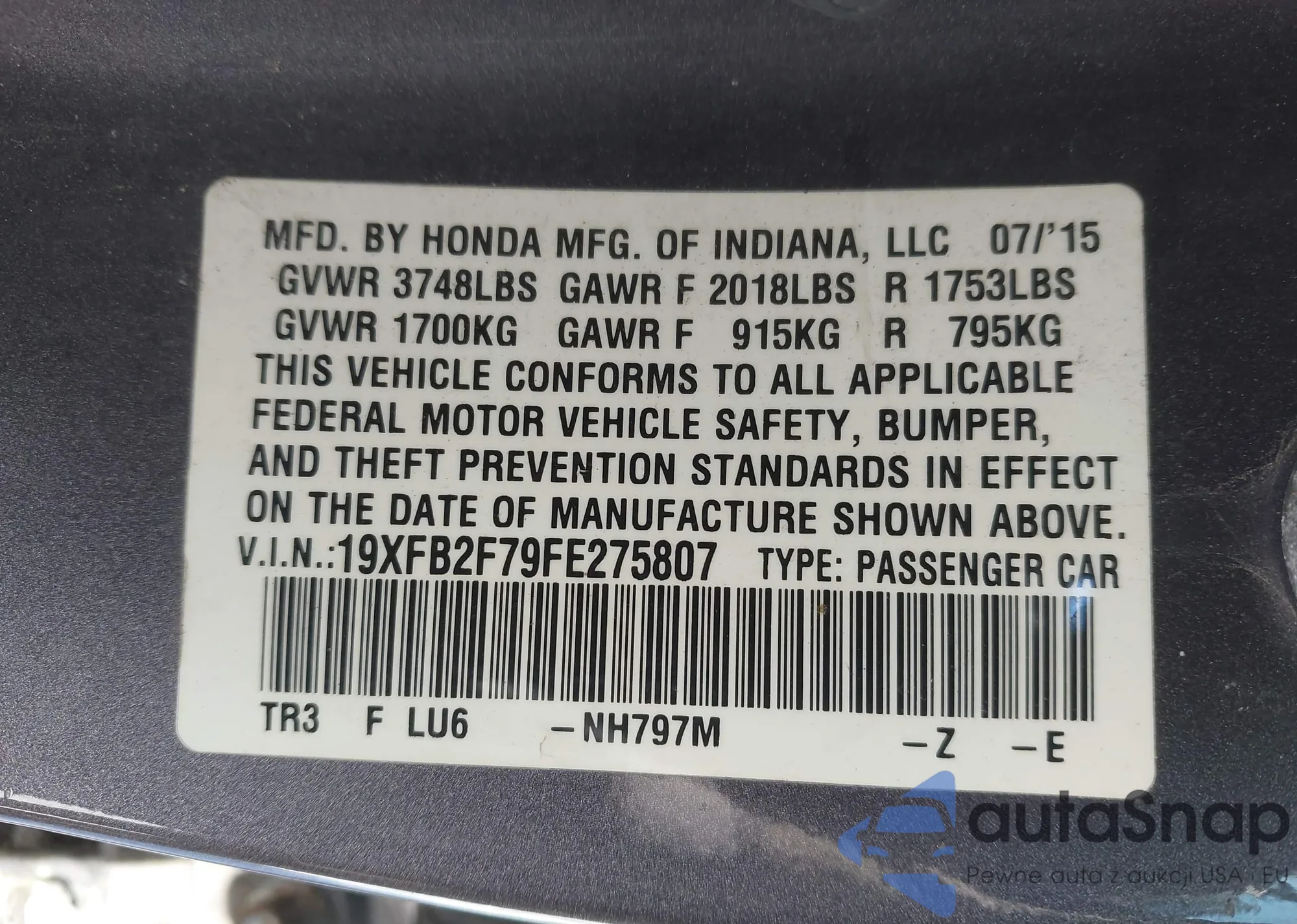 LOT: 43888113 VIN: 2HGFC1F75GH633578