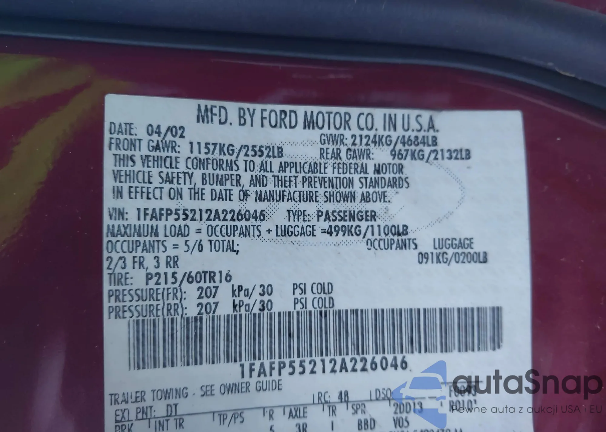 LOT: 43927854 VIN: 1FAFP55212A226046
