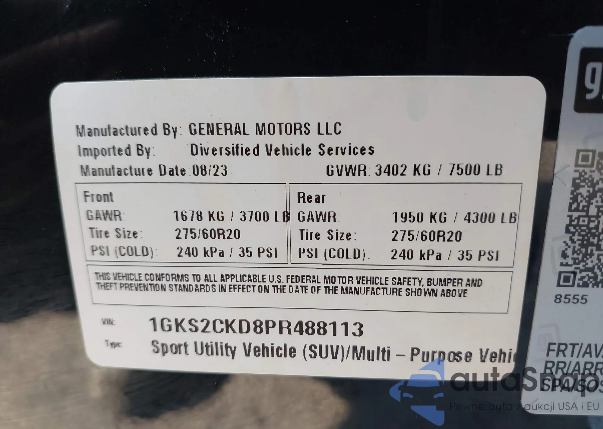 LOT: 43685548 VIN: 1GKS2CKD8PR488113