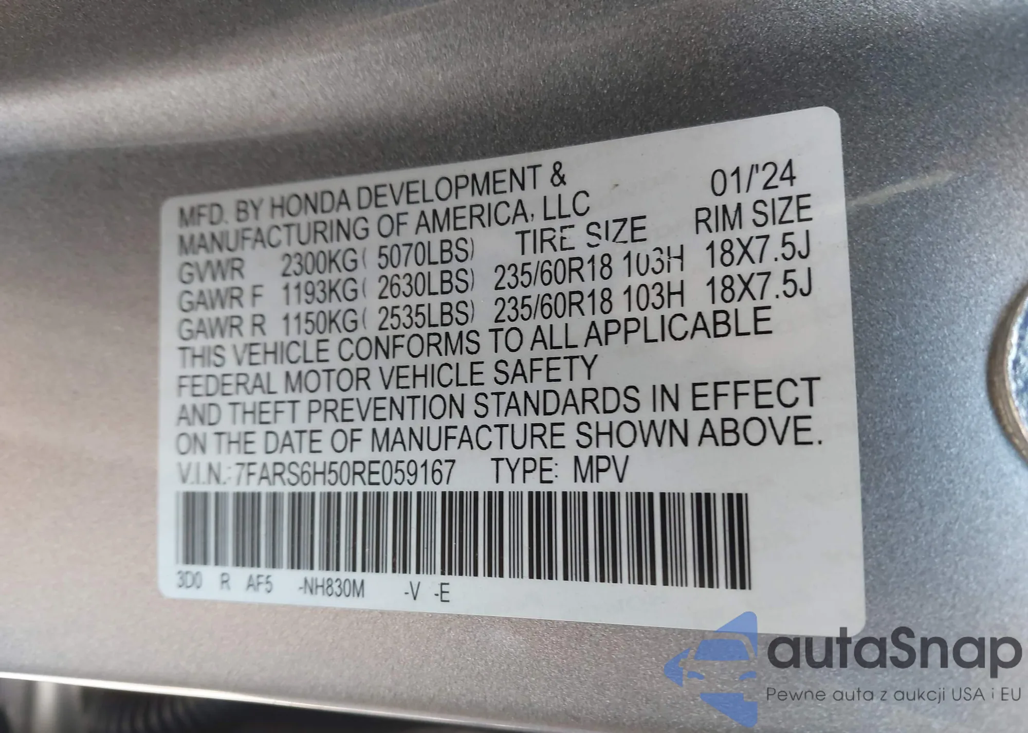 • VIN 7FARS6H50RE059167