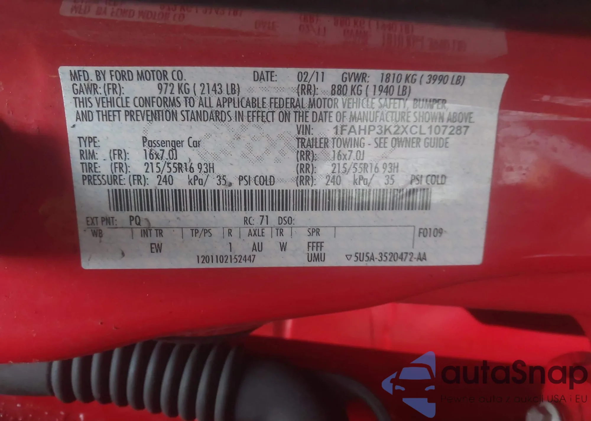 • VIN 1FAHP3K2XCL107287