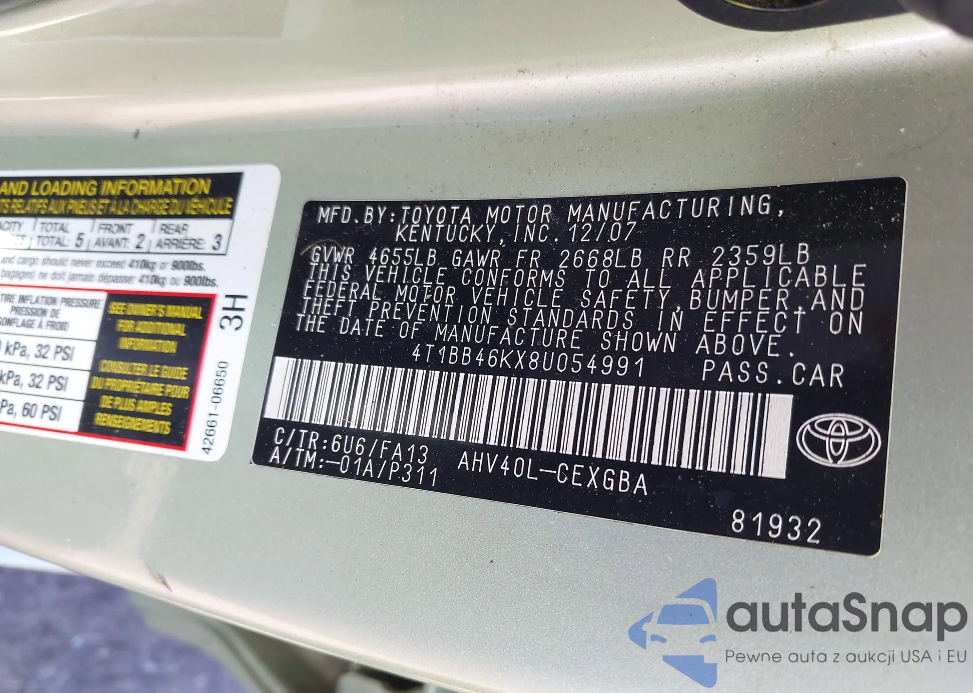 LOT: 43519535 VIN: 4T1BB46KX8U054991