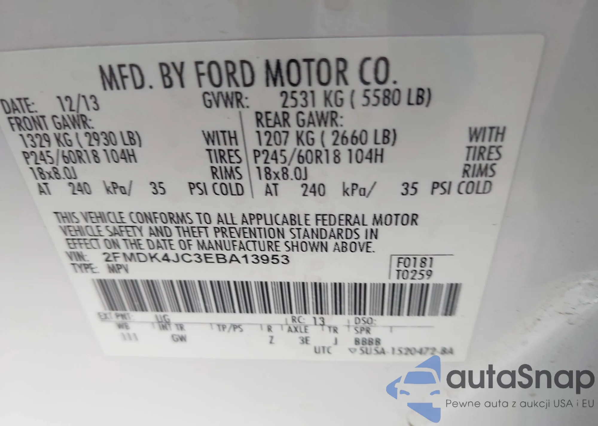 LOT: 43911803 VIN: 2FMDK4JC3EBA13953