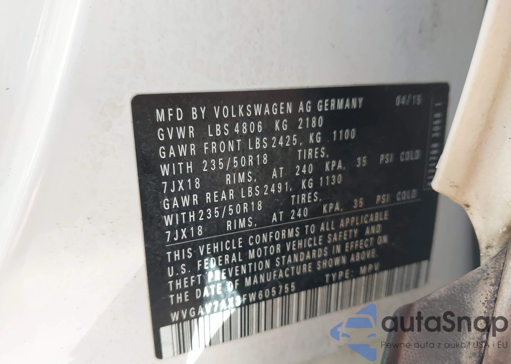 LOT: 44135228 VIN: WVGAV7AX3FW605755