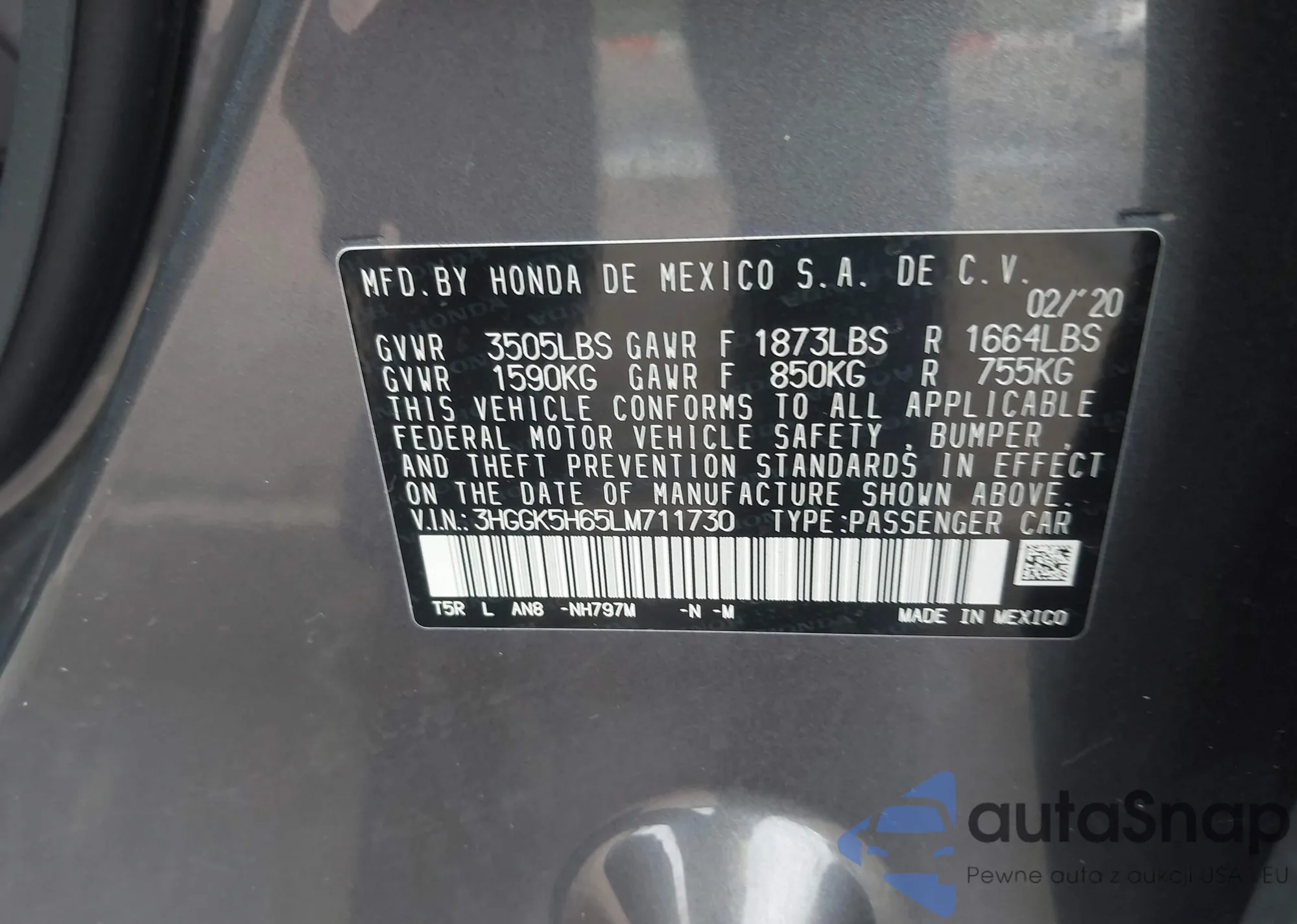 • VIN 3HGGK5H65LM711730