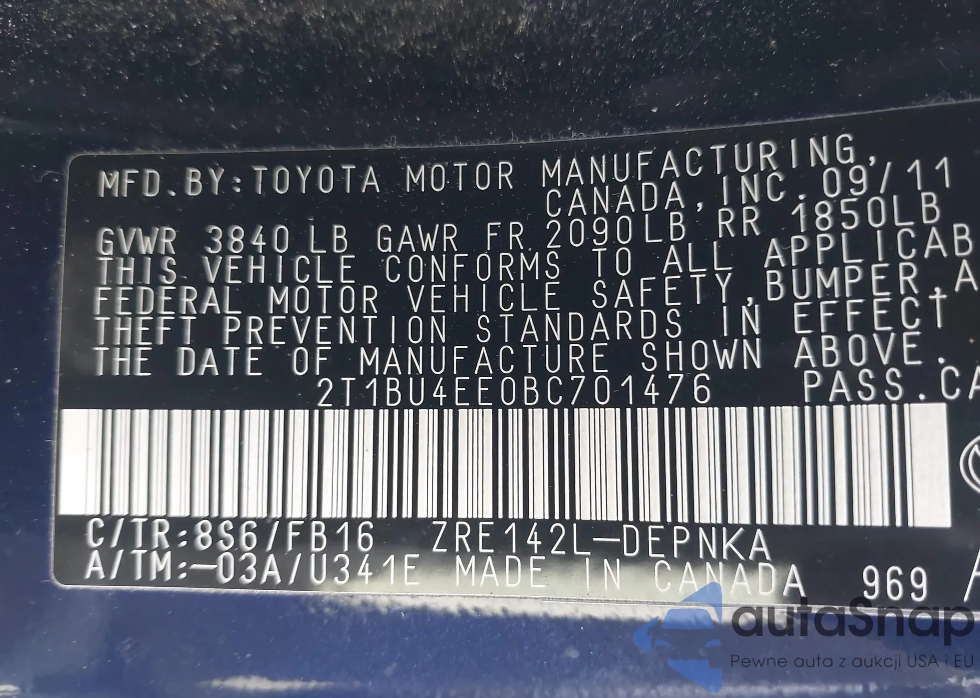 • VIN 2T1BU4EE0BC701476