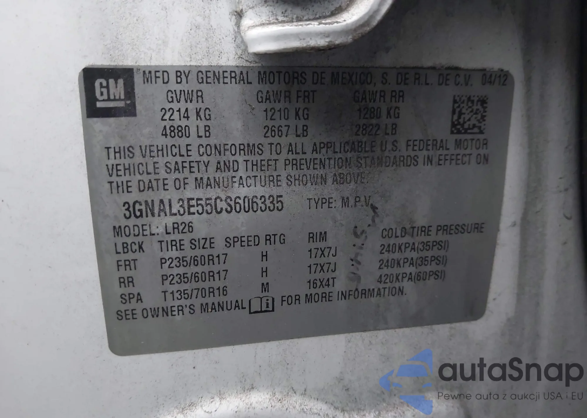 LOT: 44070562 VIN: 3GNAL3E55CS606335