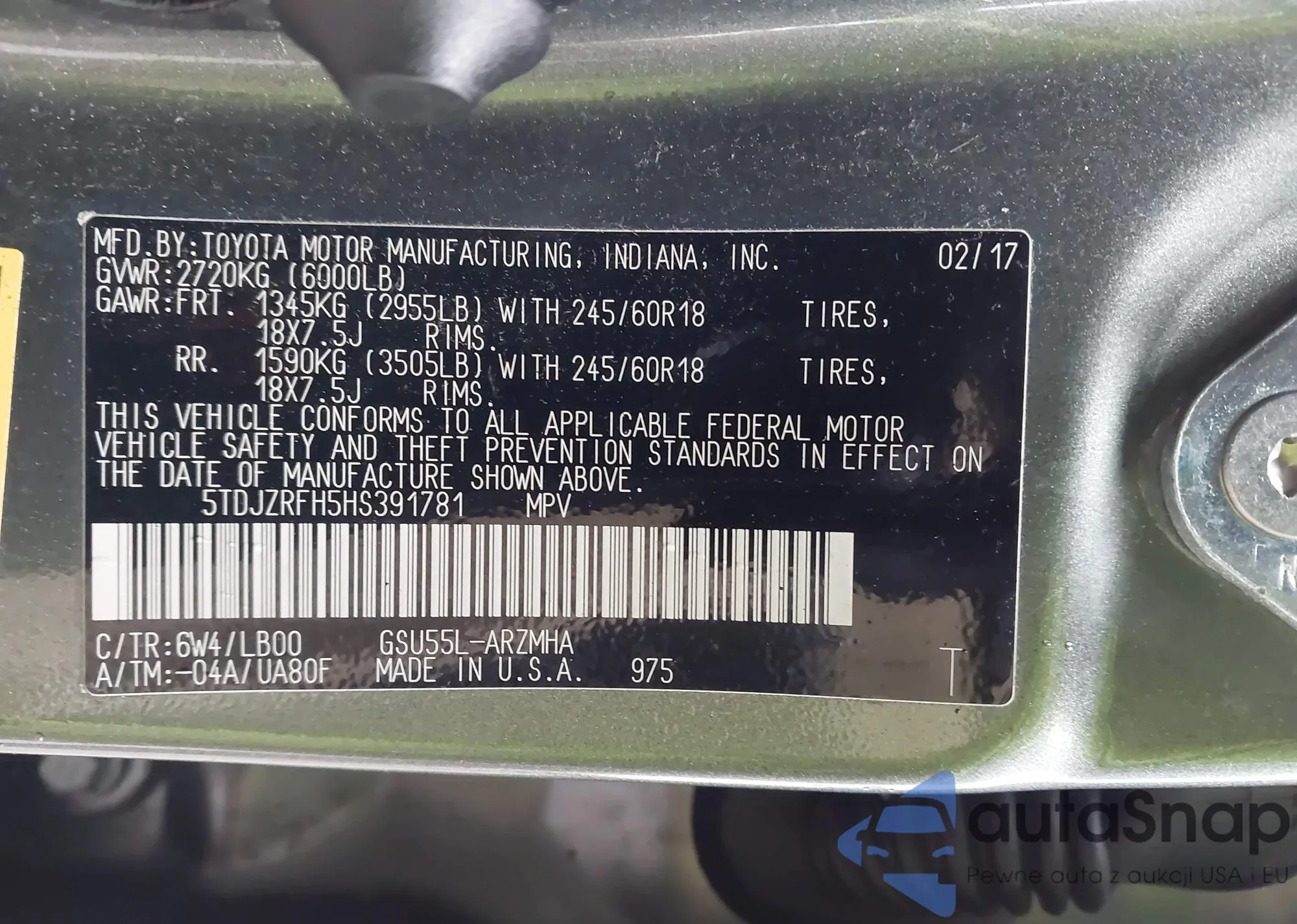 LOT: 44072870 VIN: 5TDJZRFH5HS391781