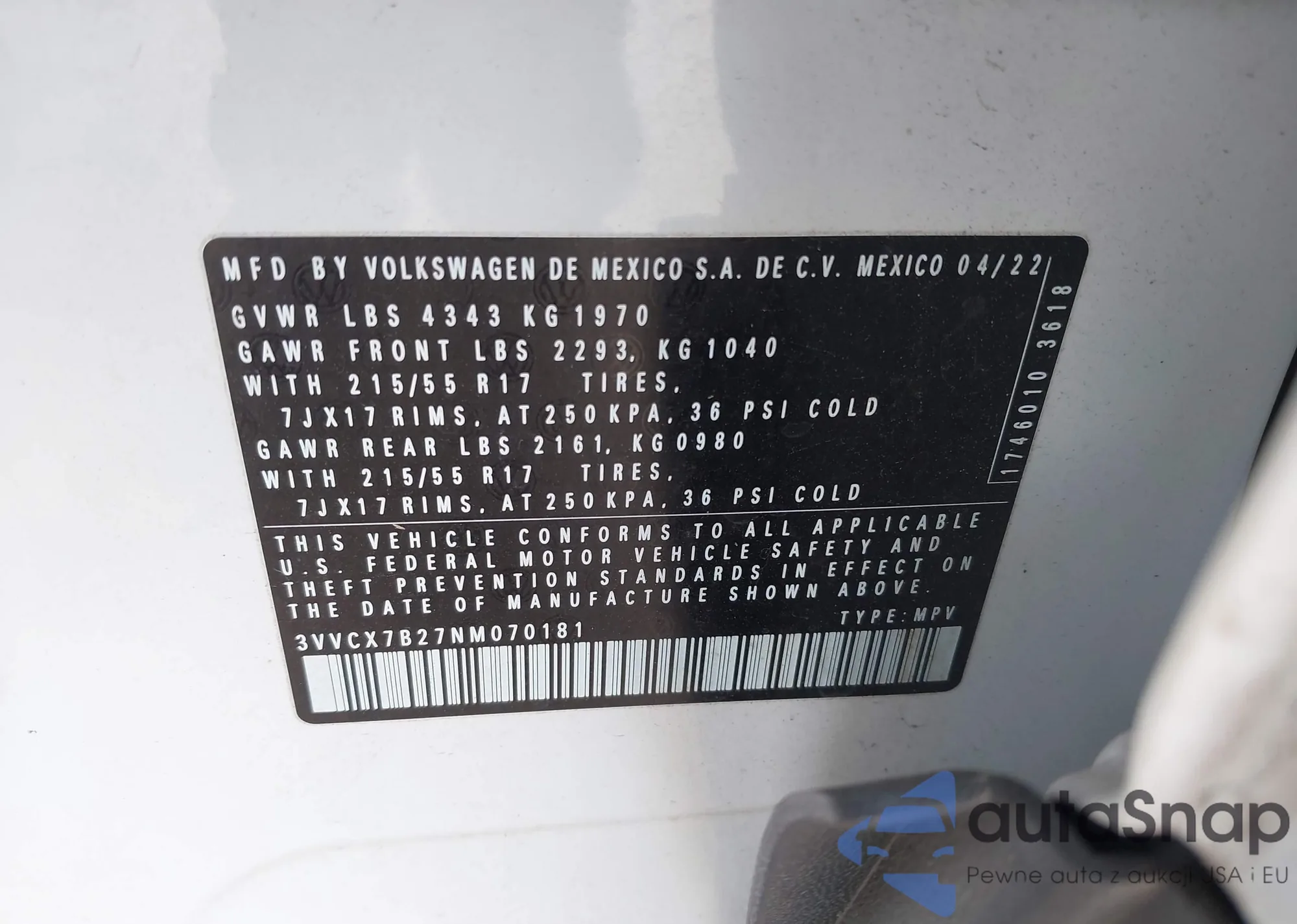 LOT: 44032927 VIN: 3VVCX7B27NM070181
