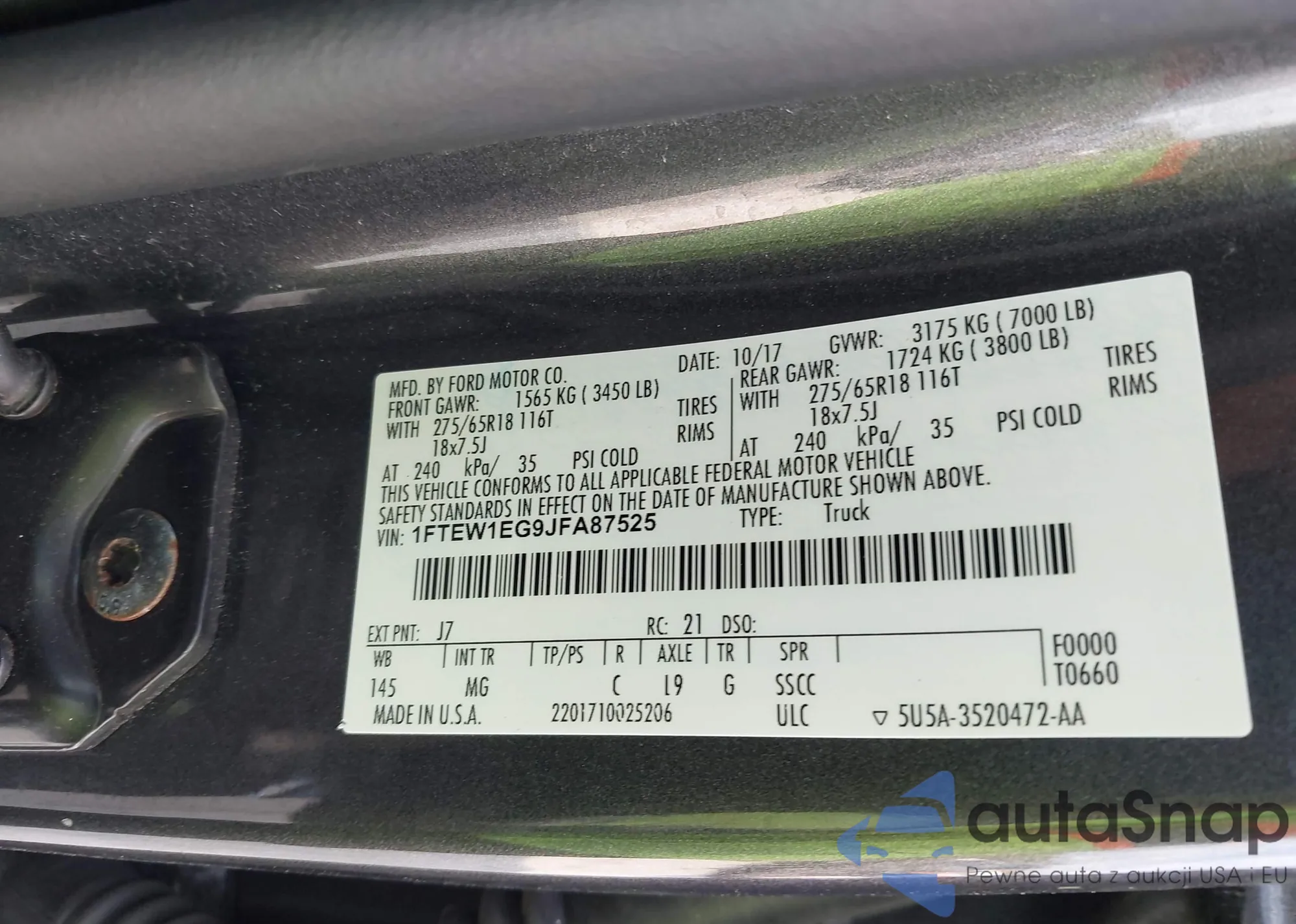 LOT: 44127411 VIN: 1FTEW1EG9JFA87525