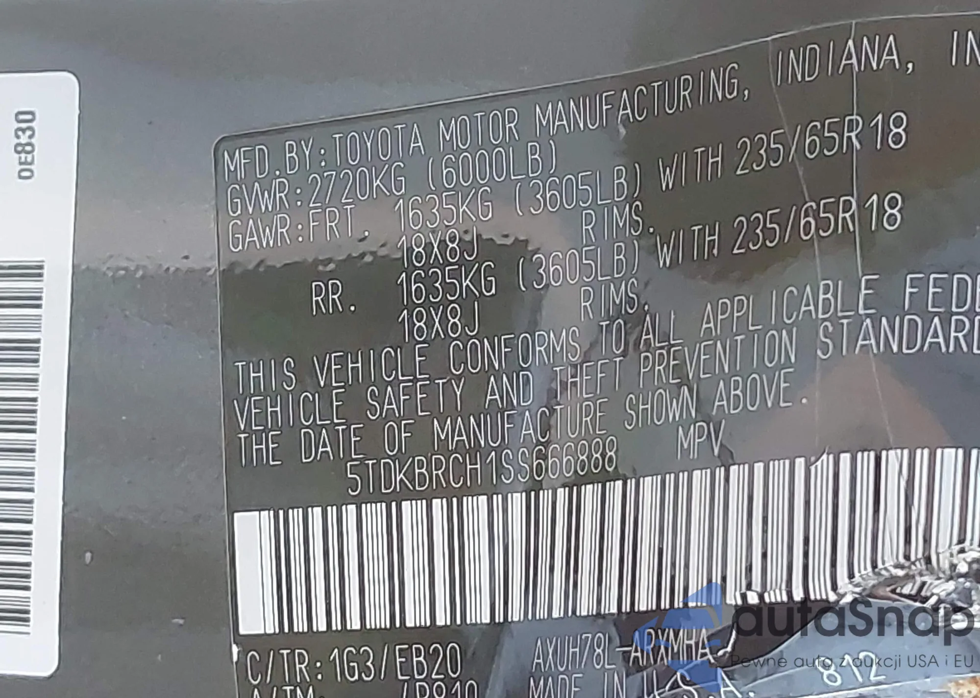 LOT: 44184859 VIN: 5TDKBRCH1SS666888