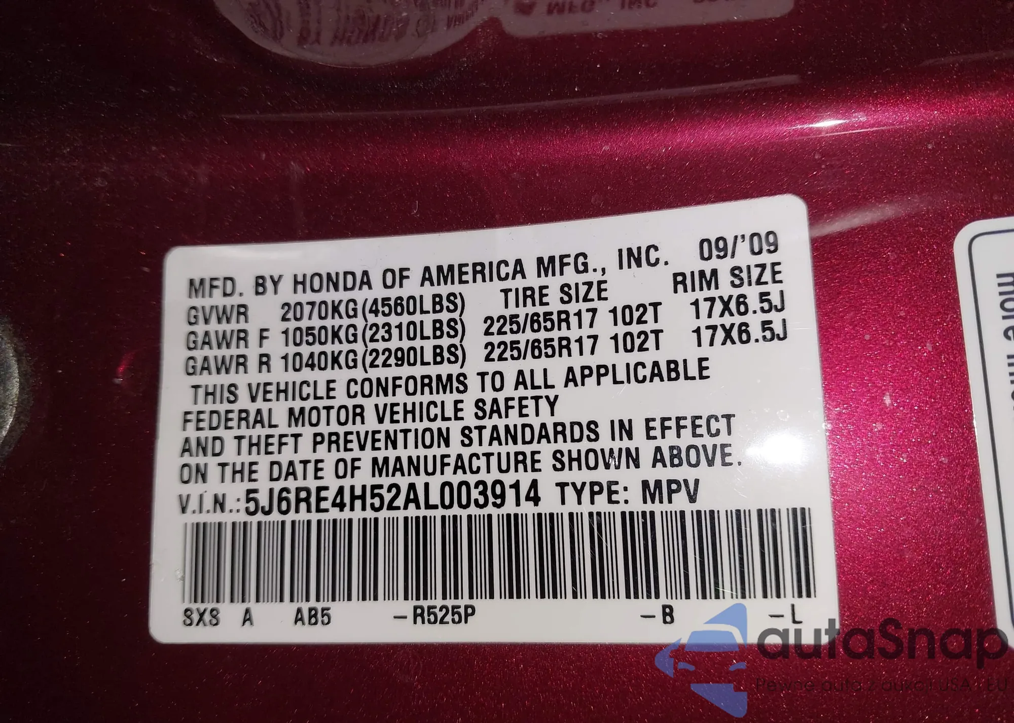 LOT: 44301010 VIN: 5J6RE4H52AL003914