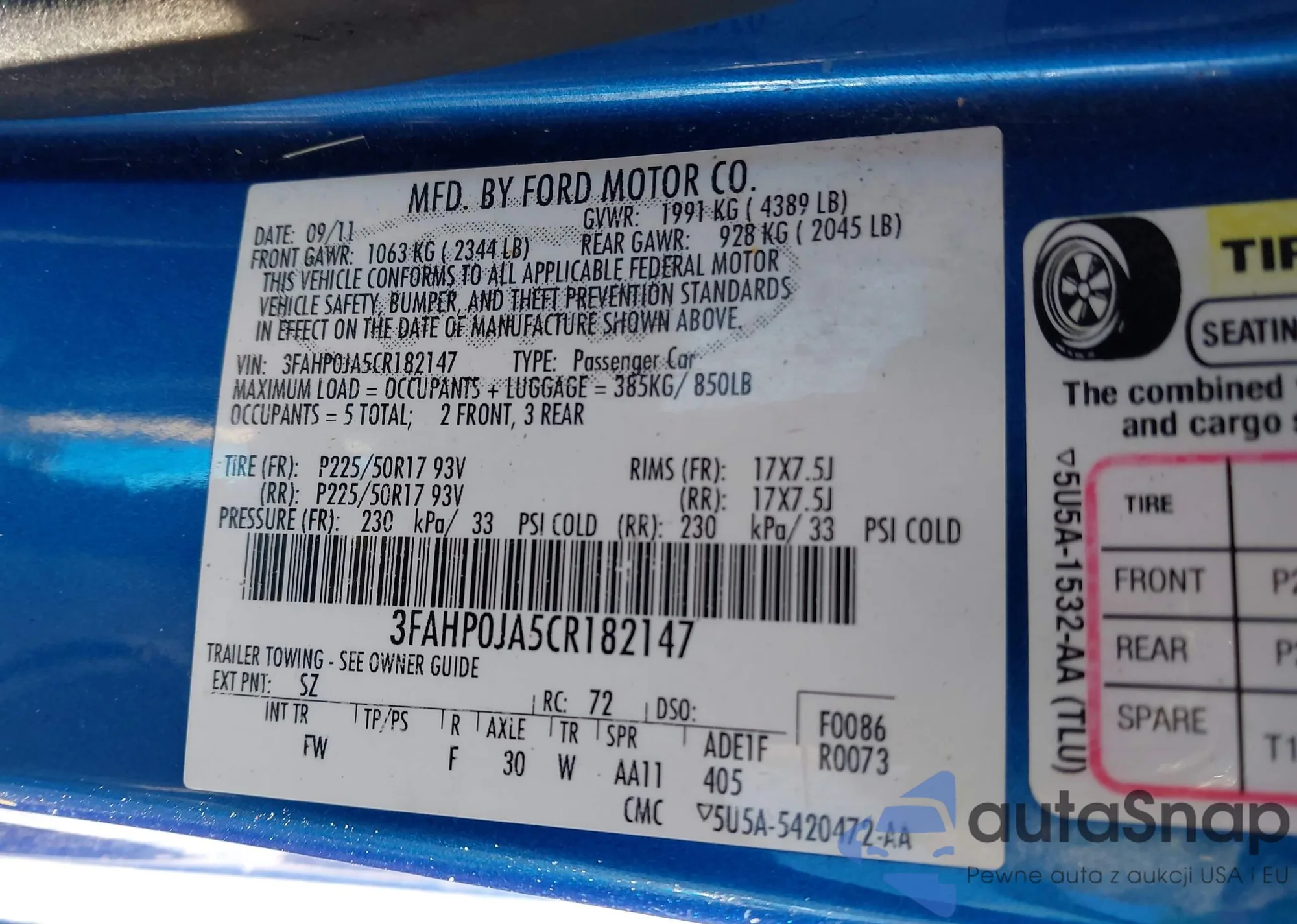 • VIN 3FAHP0JA5CR182147