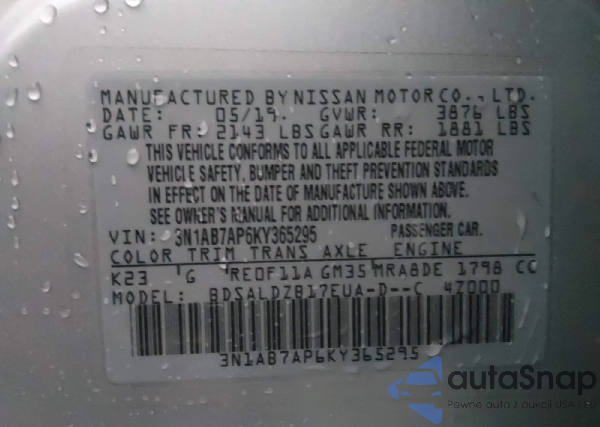 LOT: 43874407 VIN: 3N1AB7AP6KY365295