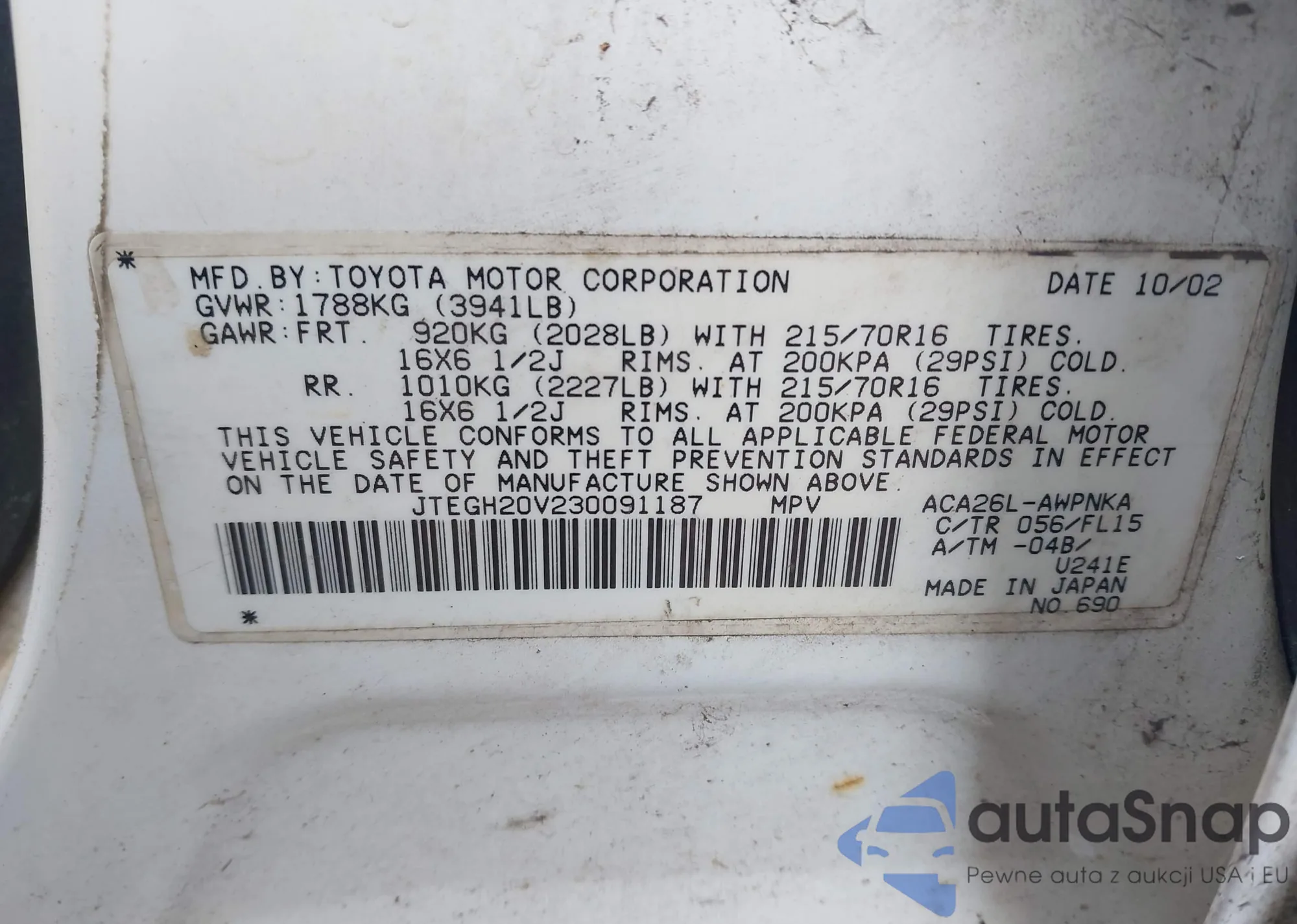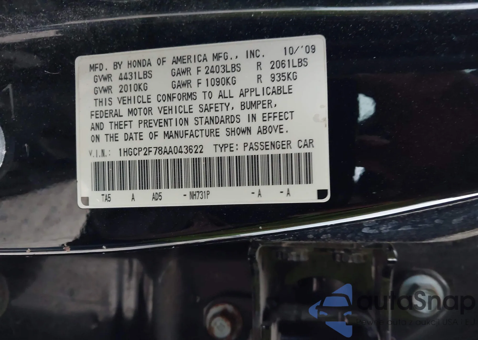 • VIN 1HGCP2F78AA043622