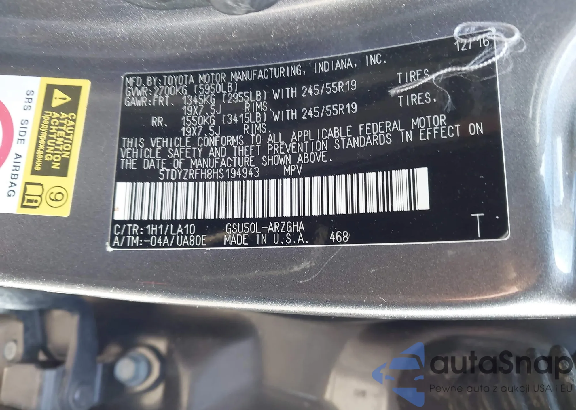 LOT: 44152071 VIN: 5TDYZRFH8HS194943