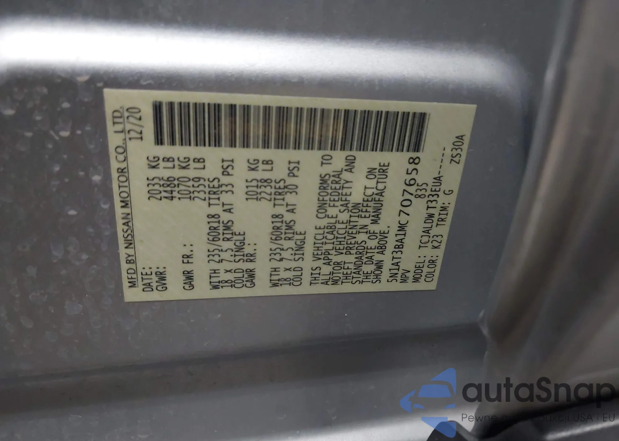 • VIN 5N1AT3BA1MC707658