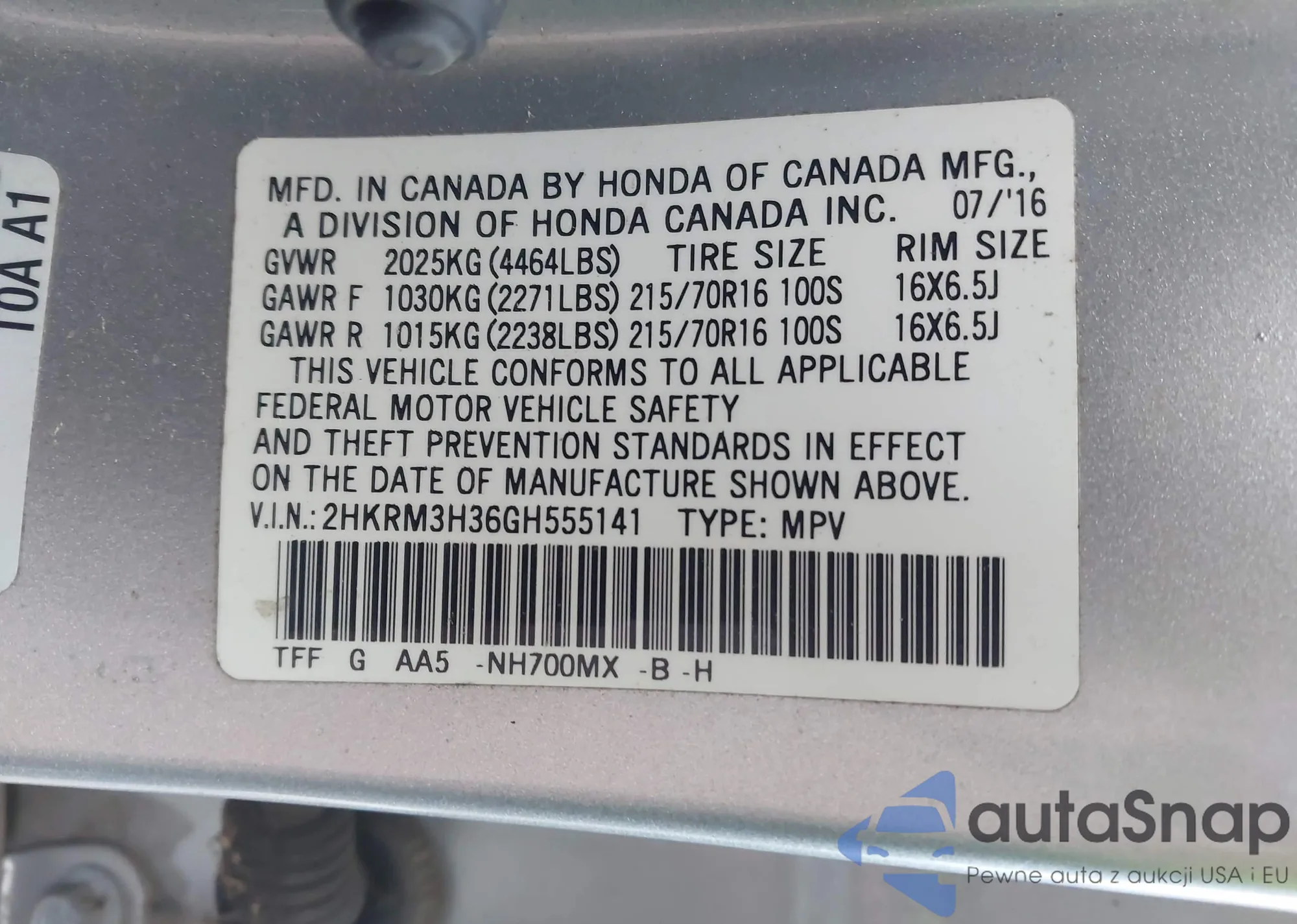 • VIN 2HKRM3H36GH555141