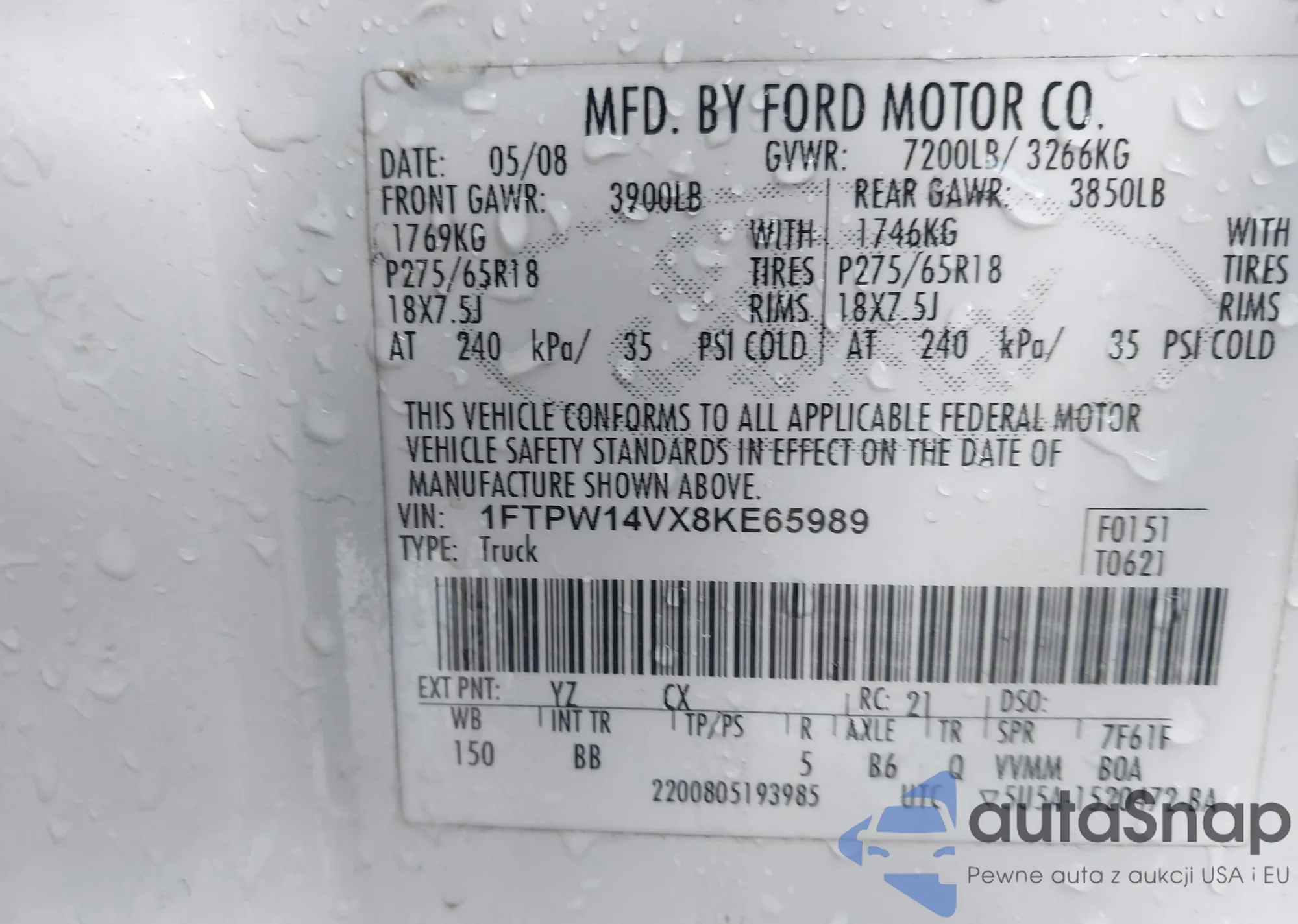 • VIN 1FTPW14VX8KE65989