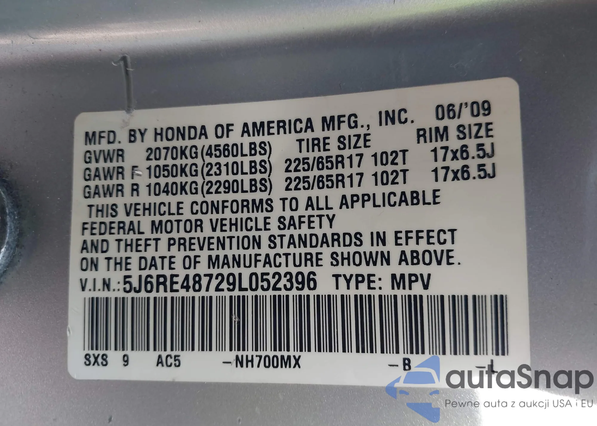 • VIN 5J6RE48729L052396