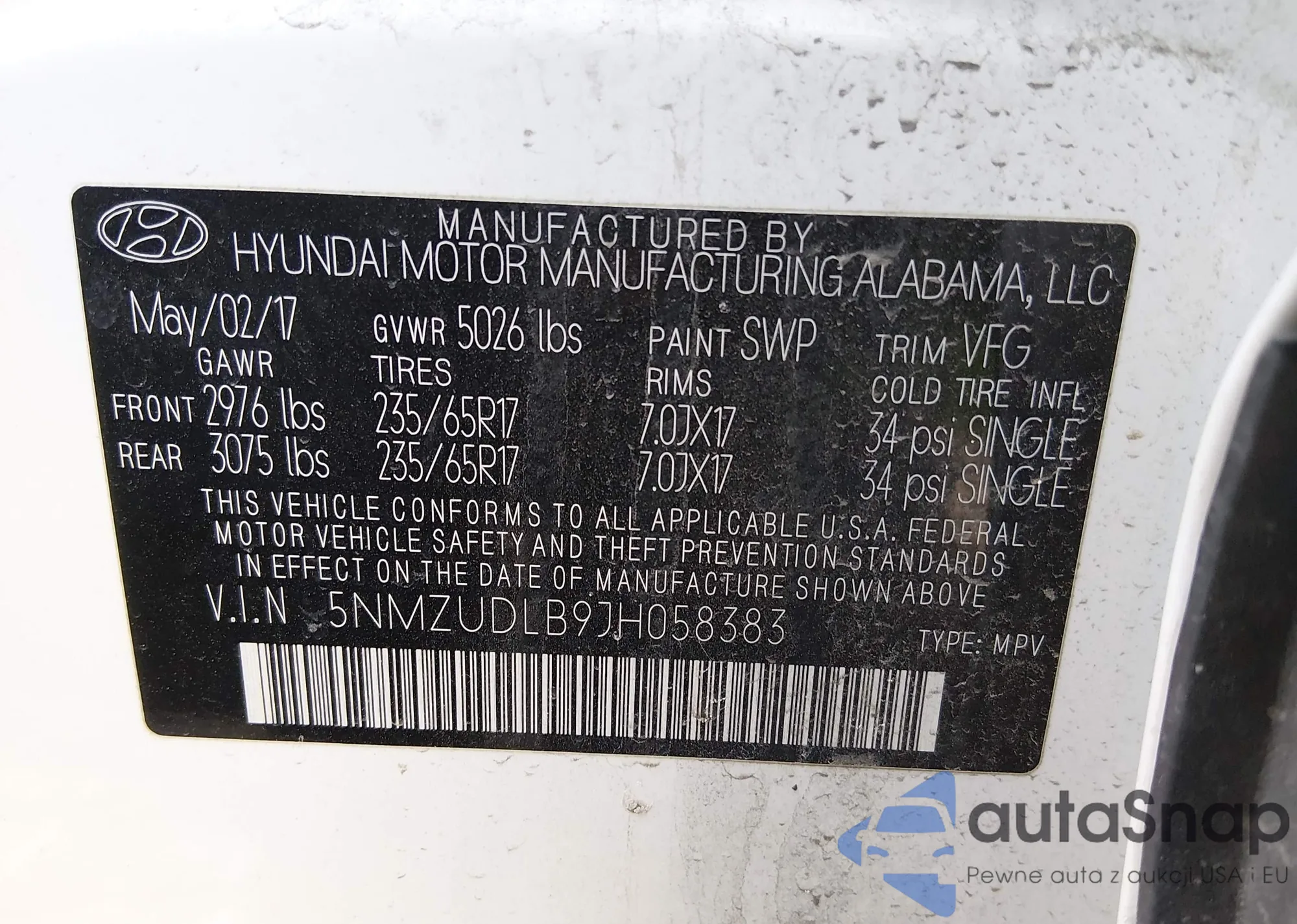 • VIN 5NMZUDLB9JH058383