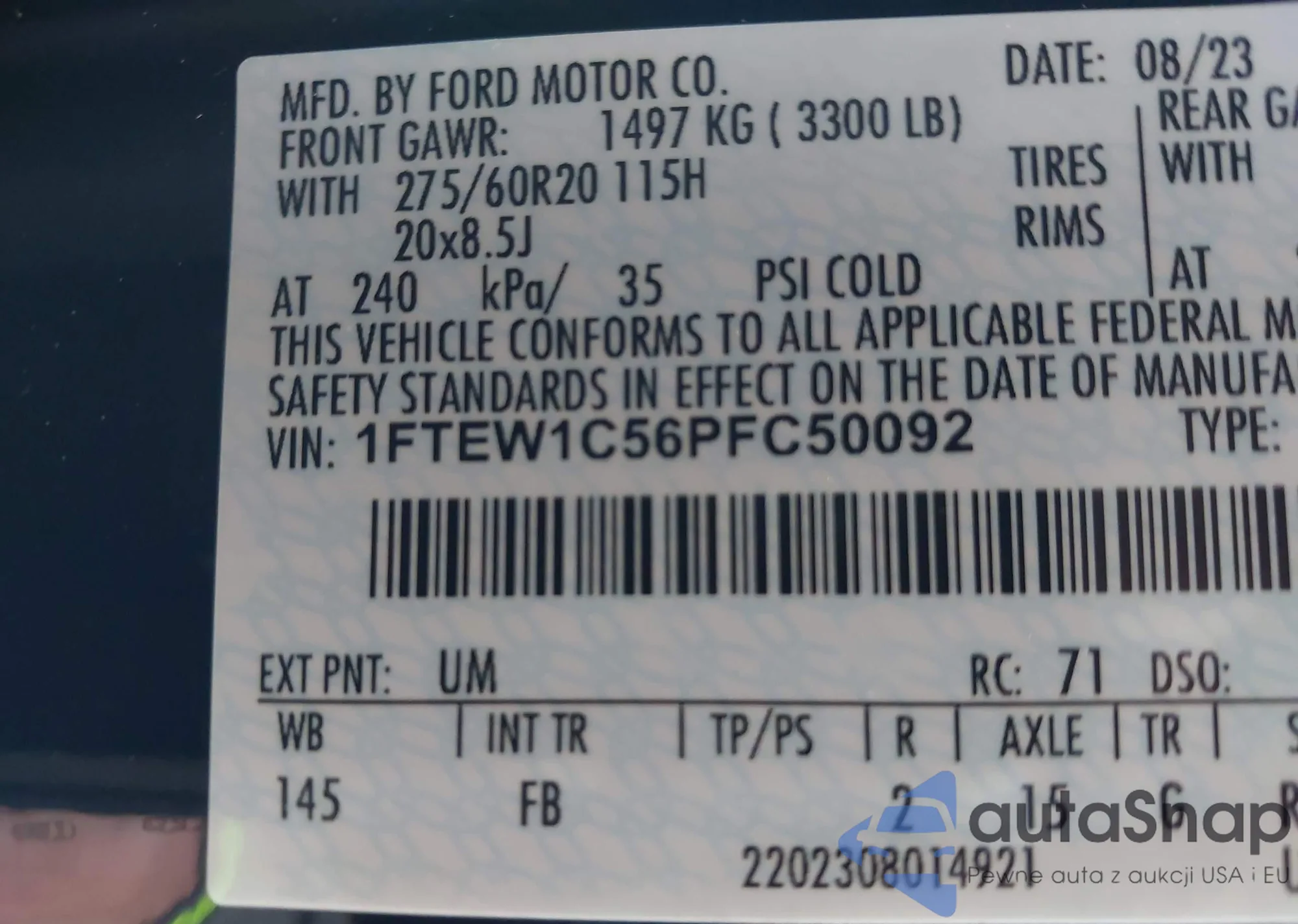 LOT: 43830892 VIN: 1FTEW1C56PFC50092
