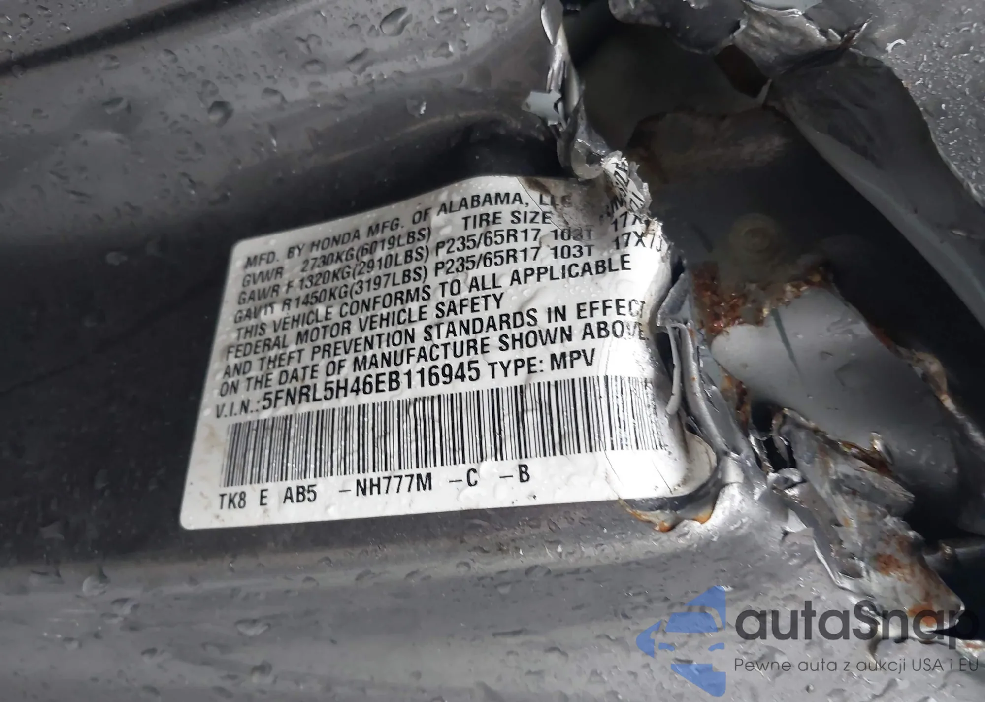 • VIN 5FNRL5H46EB116945