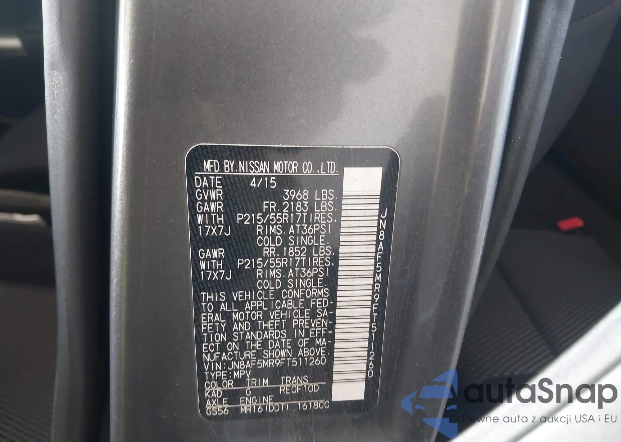 LOT: 43916857 VIN: JN8AF5MR9FT511260