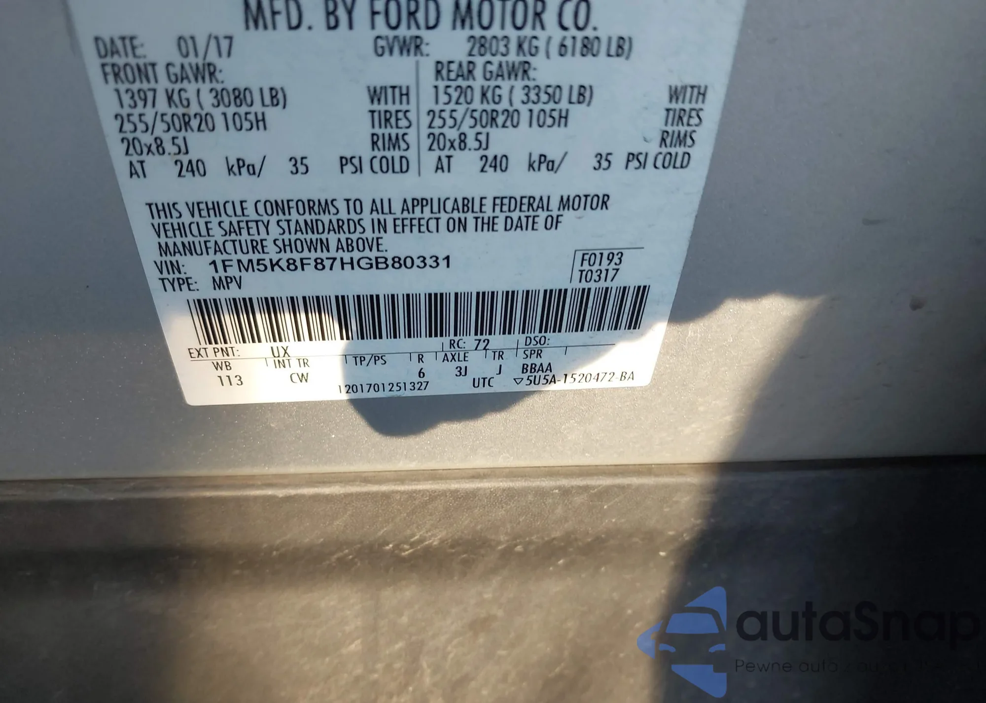 LOT: 43931931 VIN: 1FM5K8F87HGB80331