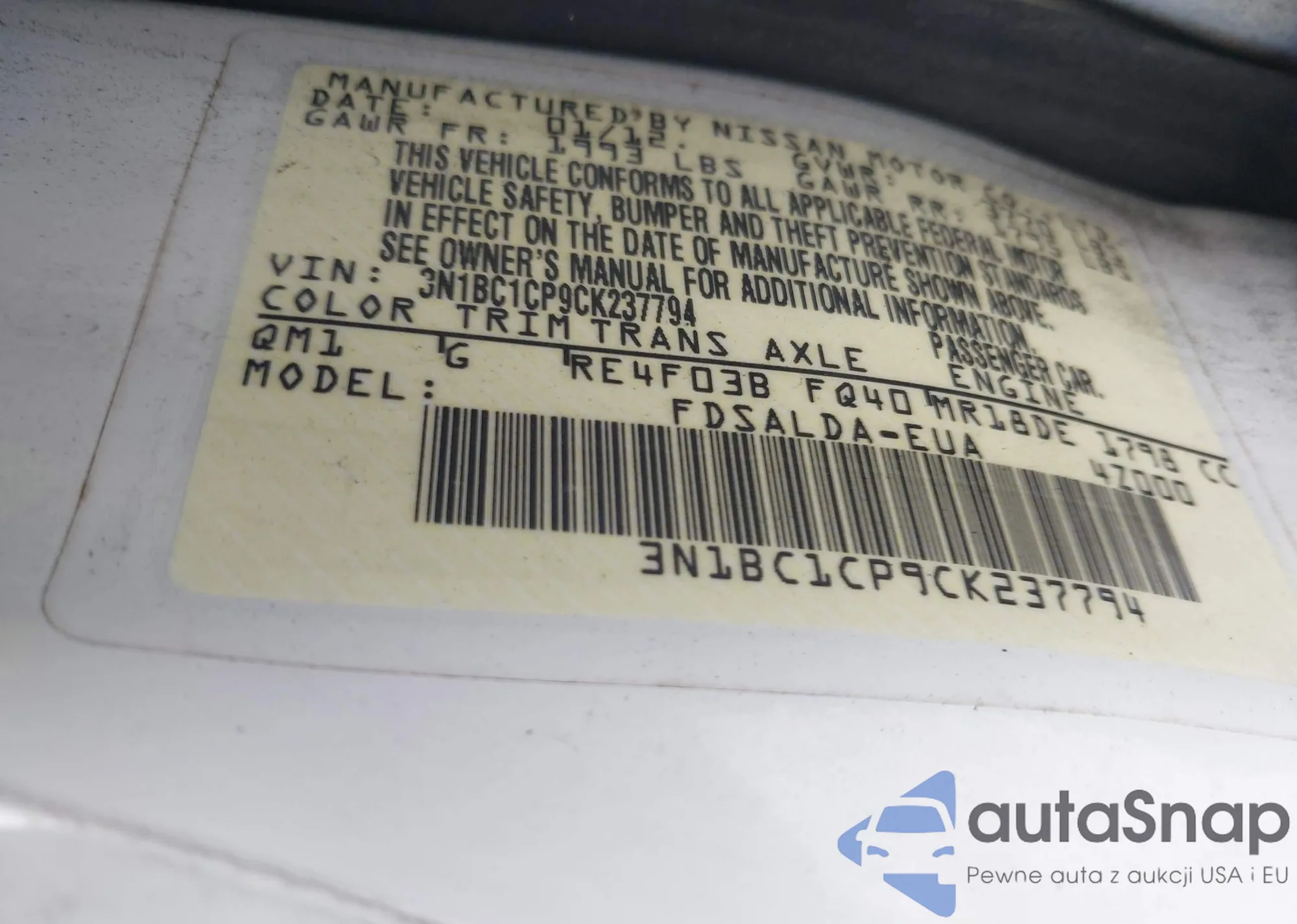 LOT: 43970340 VIN: 3N1BC1CP9CK237794