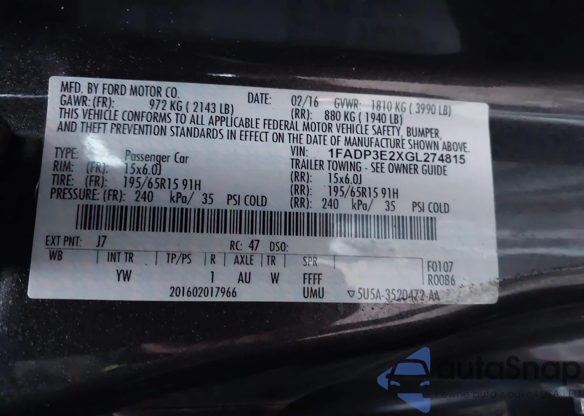 LOT: 43792659 VIN: 1FADP3E2XGL274815