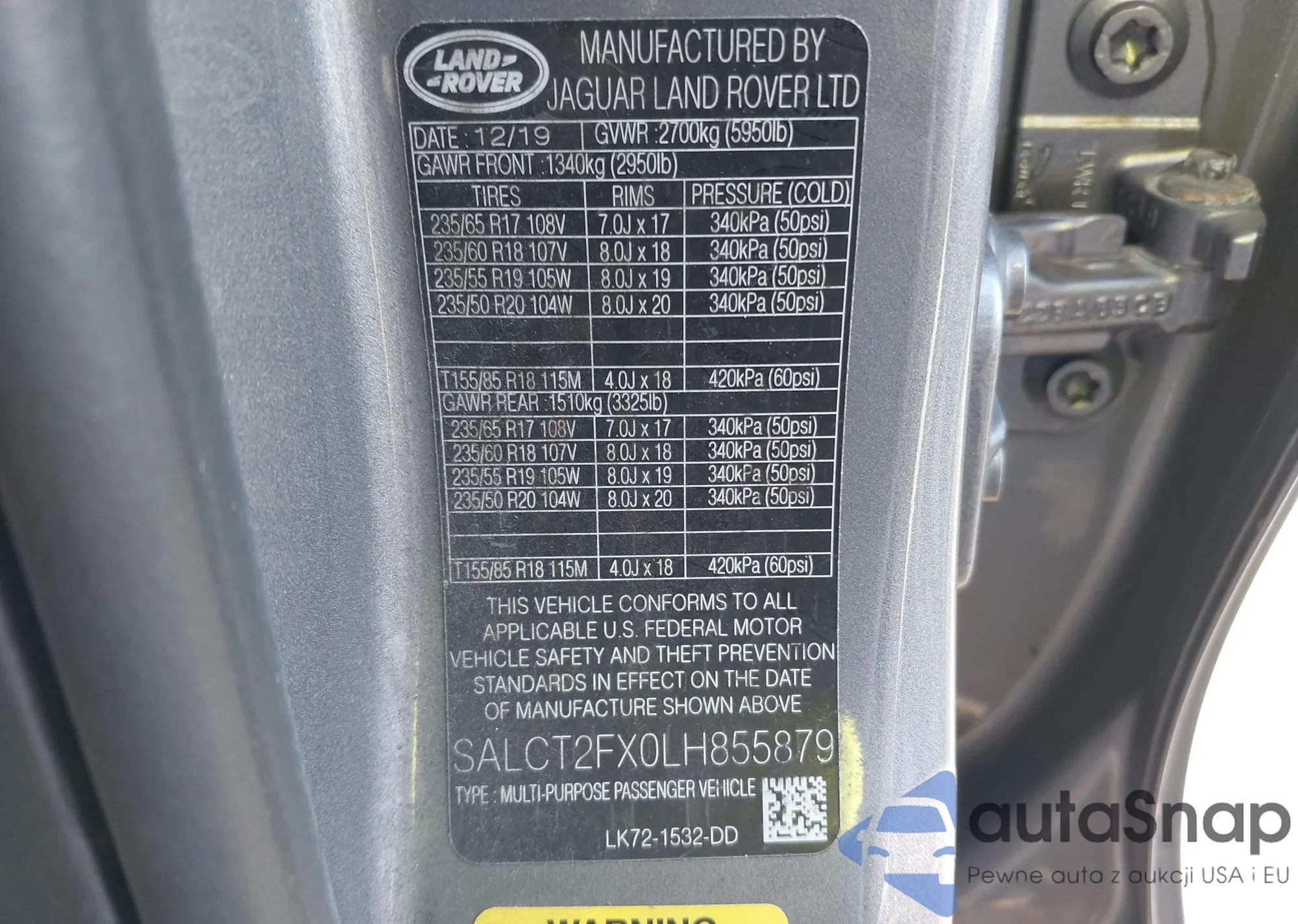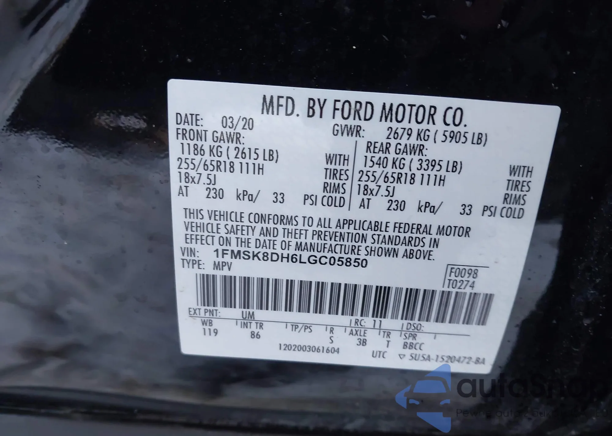 LOT: 44103425 VIN: 1FMSK8DH6LGC05850