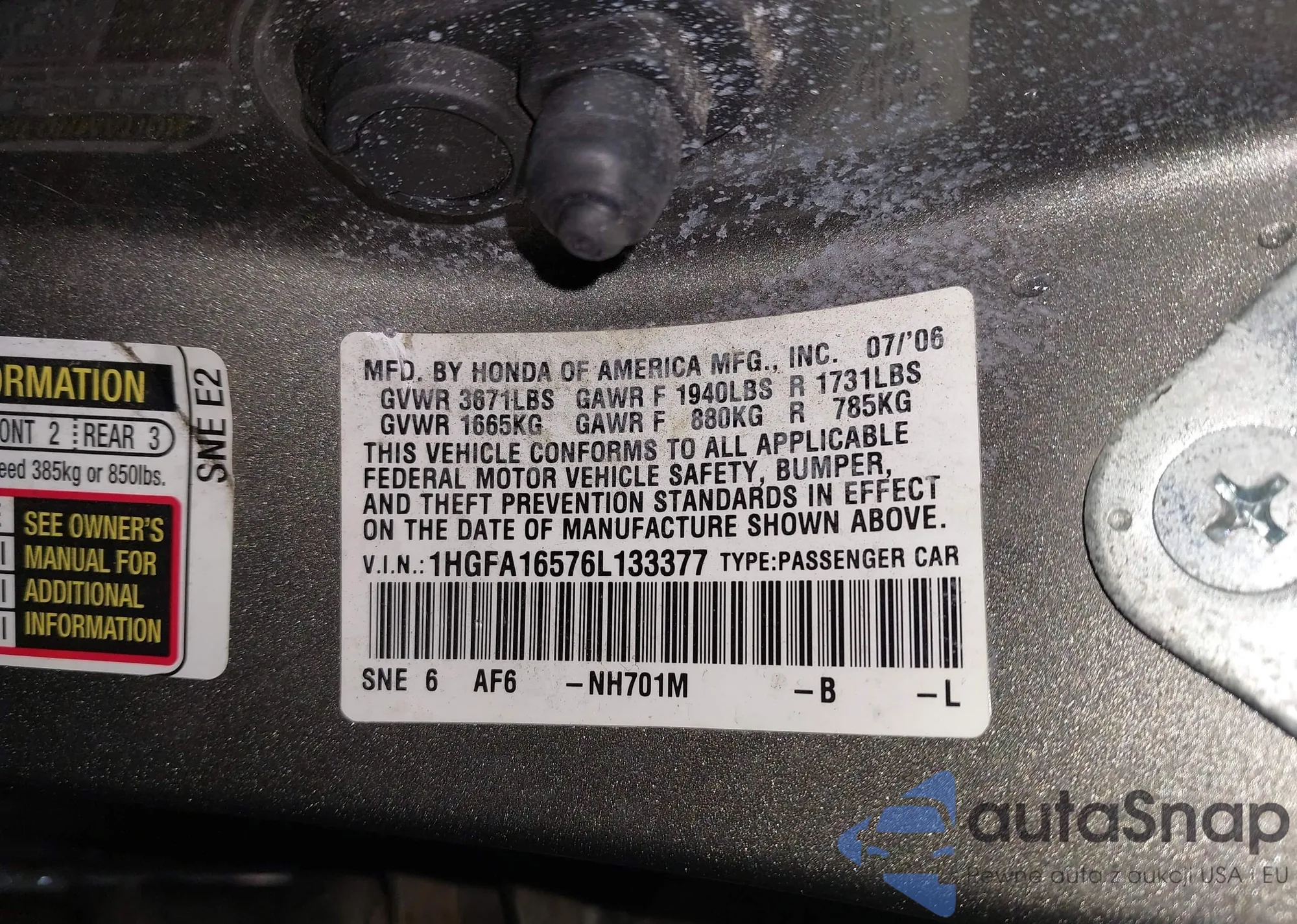 LOT: 43983770 VIN: 1HGFA16576L133377