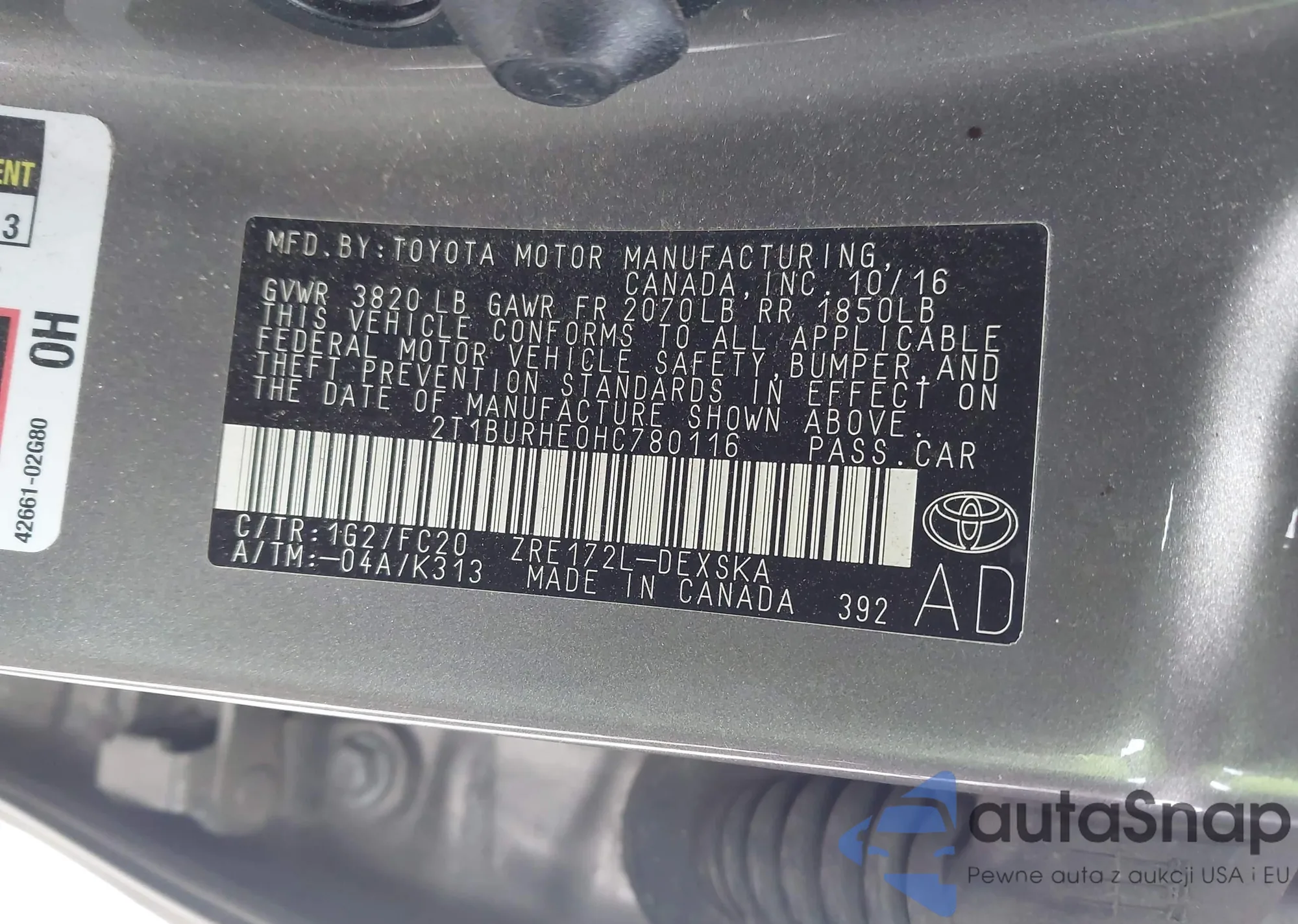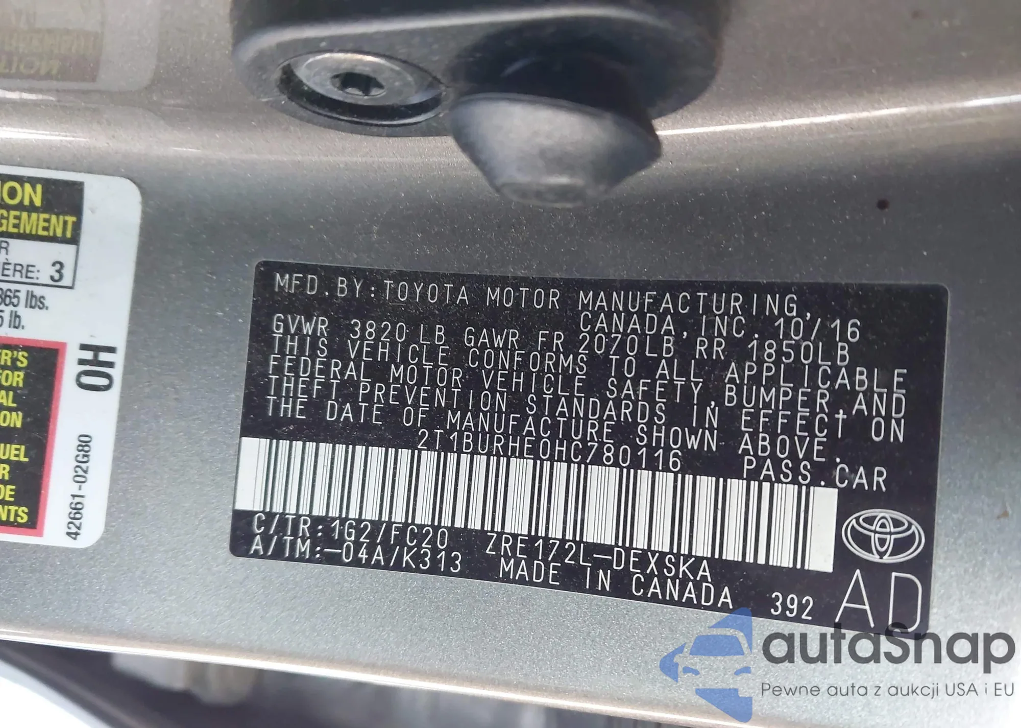 LOT: 44203947 VIN: 2T1BURHE0HC780116