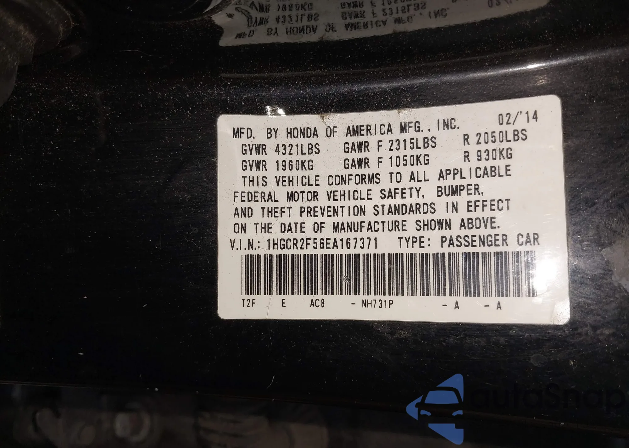 • VIN 1HGCR2F56EA167371