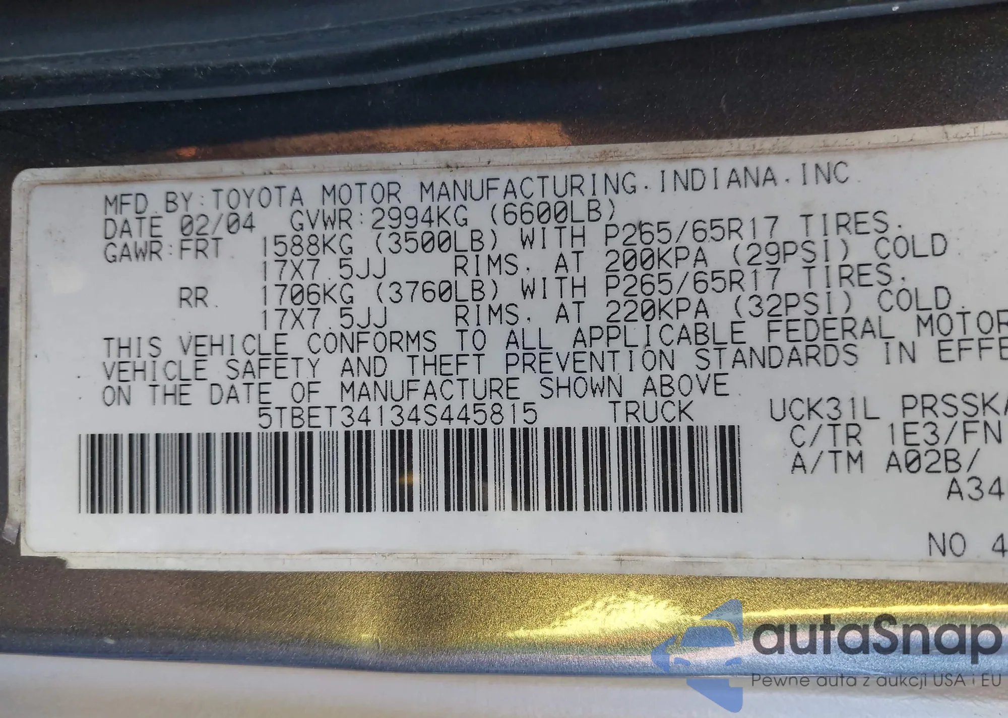 LOT: 44024423 VIN: 5TBET34134S445815