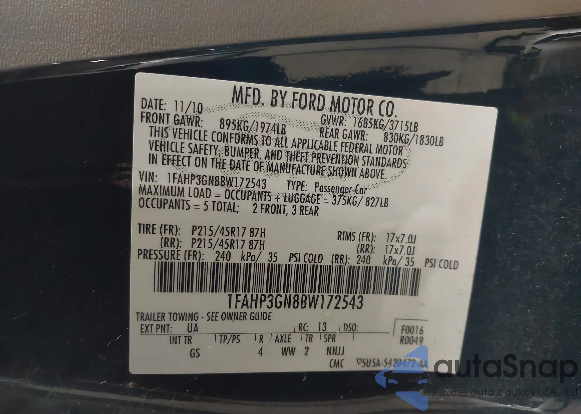 • VIN 1FAHP3GN8BW172543