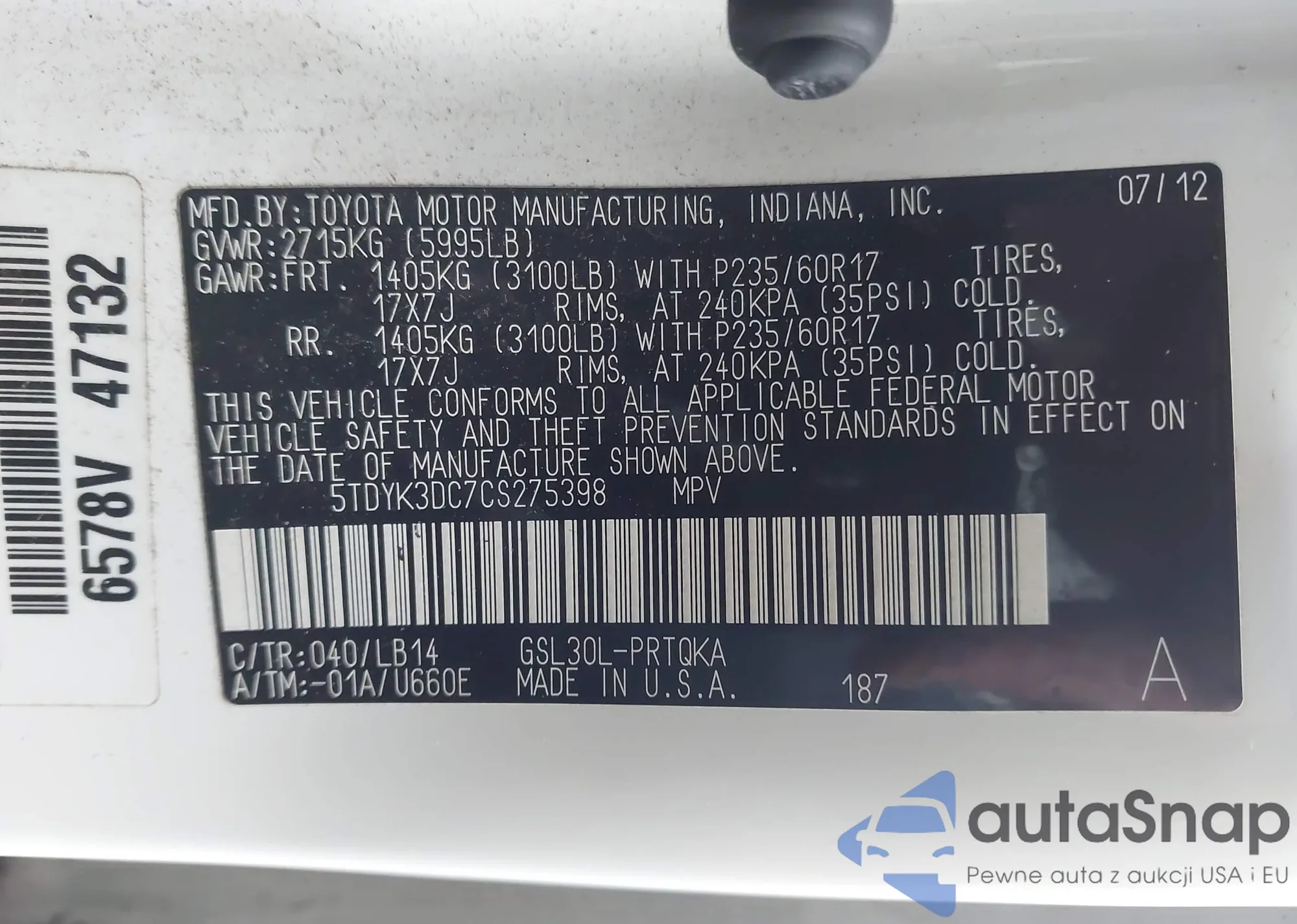 • VIN 5TDYK3DC7CS275398