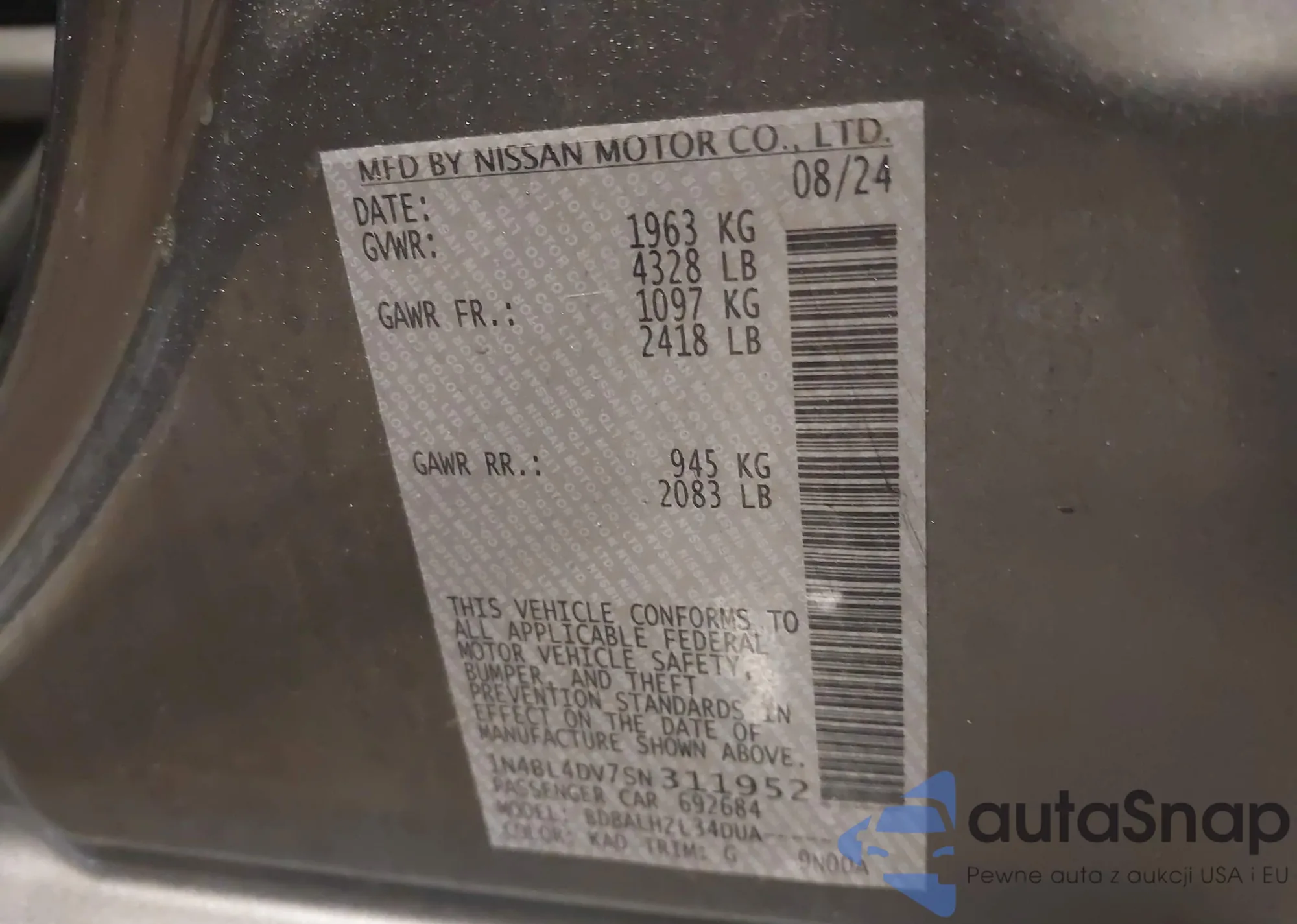 LOT: 44105939 VIN: 1N4BL4DV7SN311952