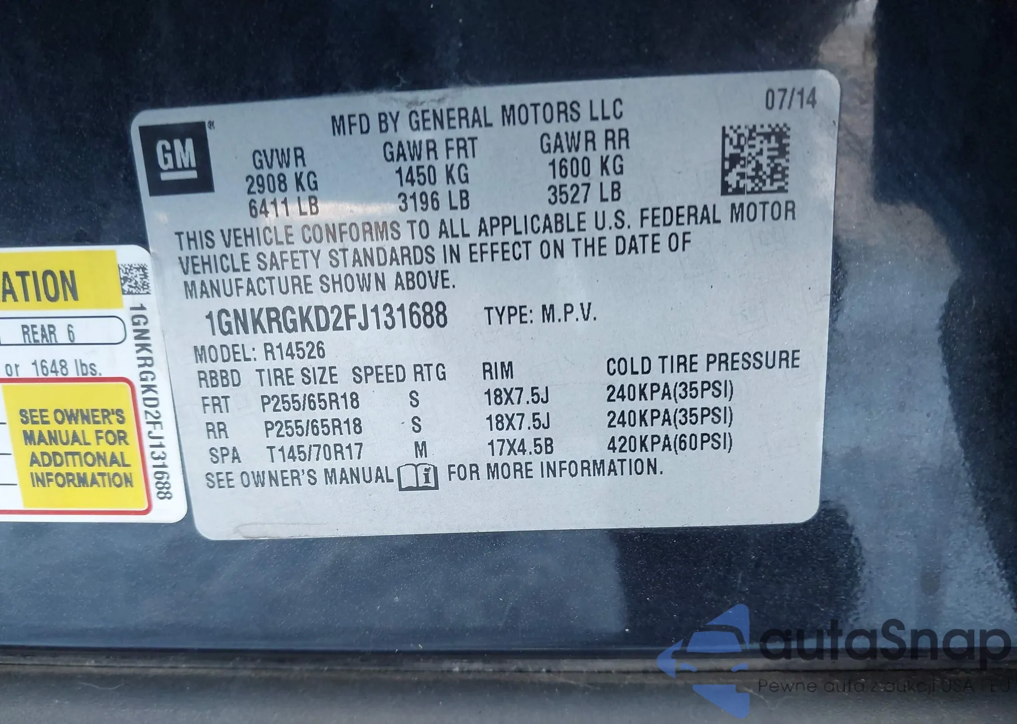LOT: 44180973 VIN: 1GNKRGKD2FJ131688
