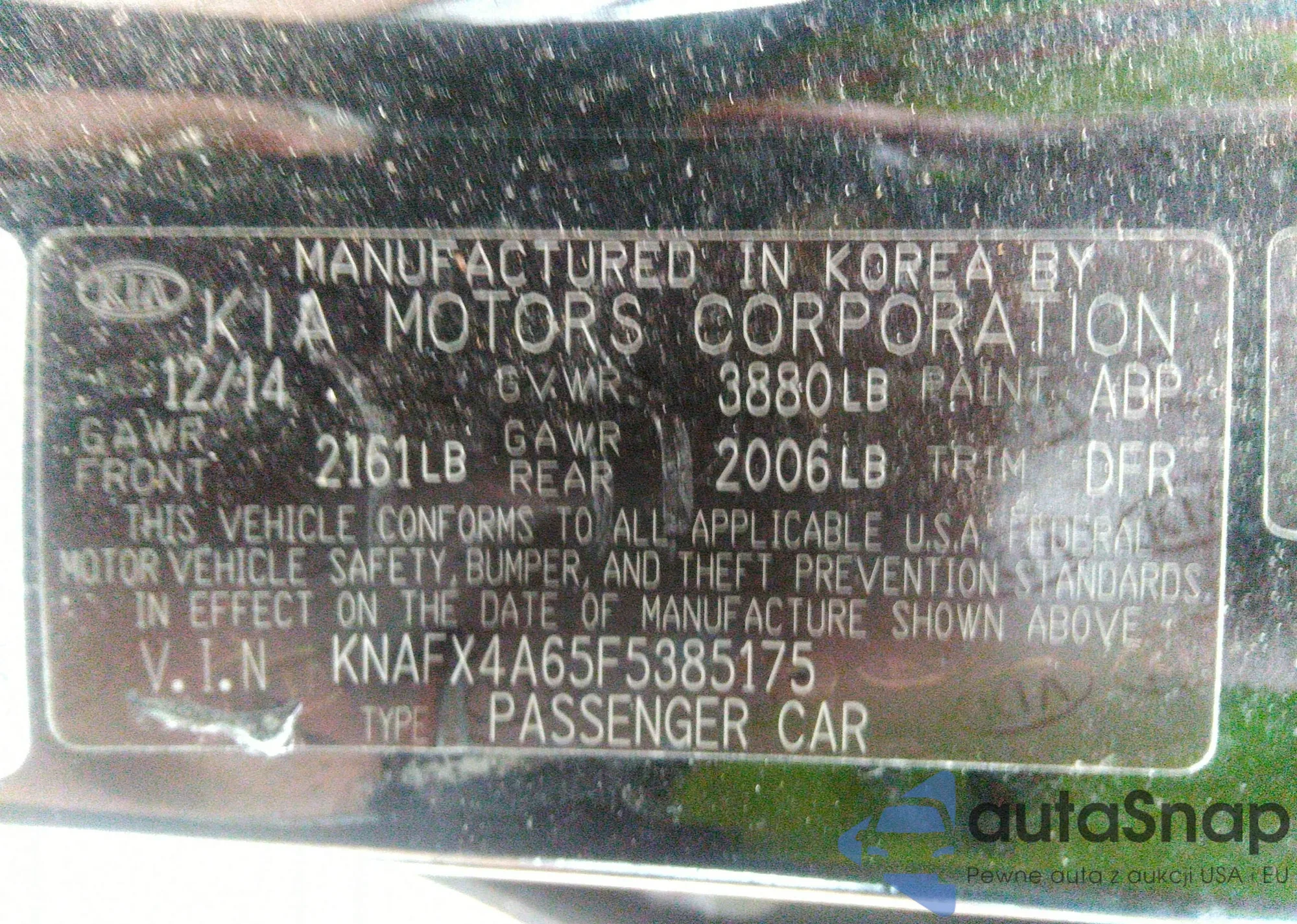 LOT: 43393715 VIN: KNAFX4A65F5385175