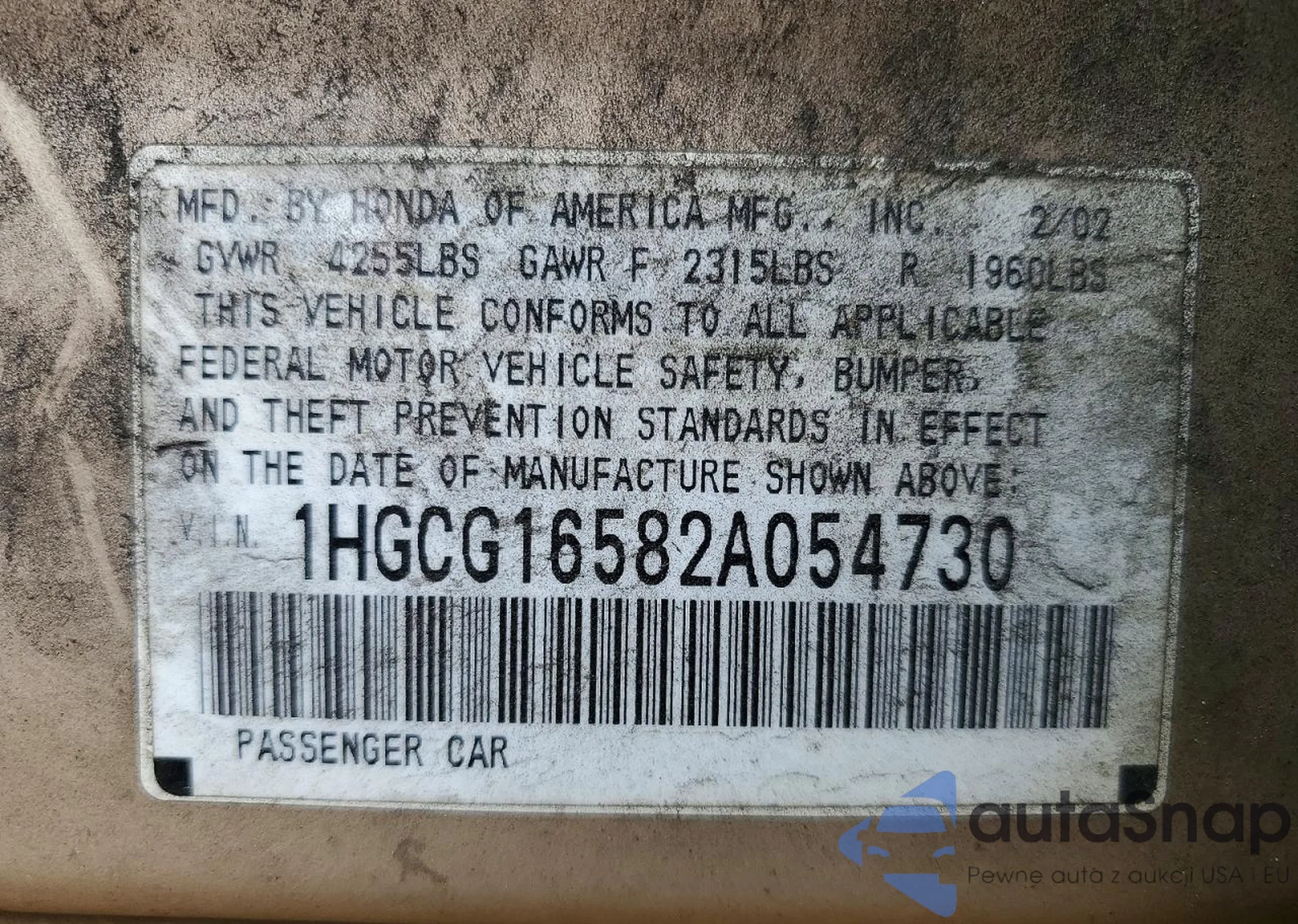 LOT: 99897265 VIN: 1HGCG16582A054730