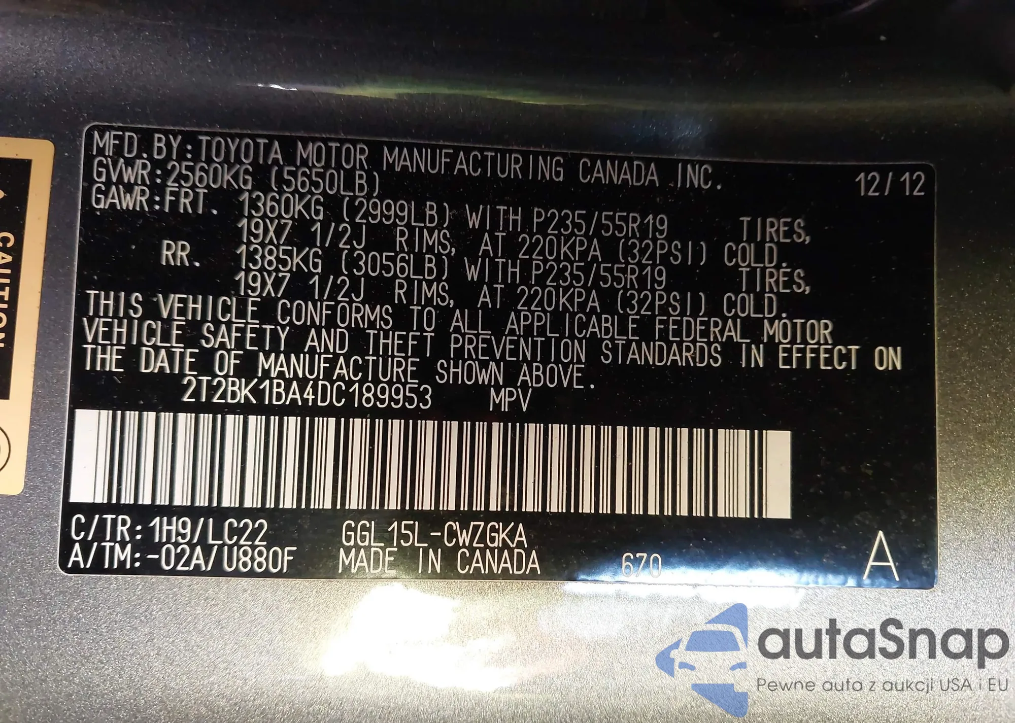 • VIN 5TDEZ3DC5KS216315