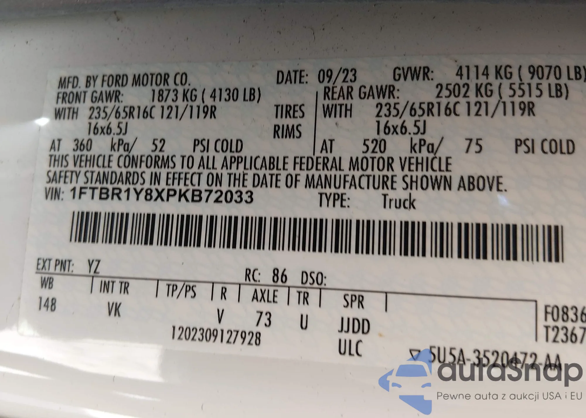 • VIN 1FTBR1Y8XPKB72033