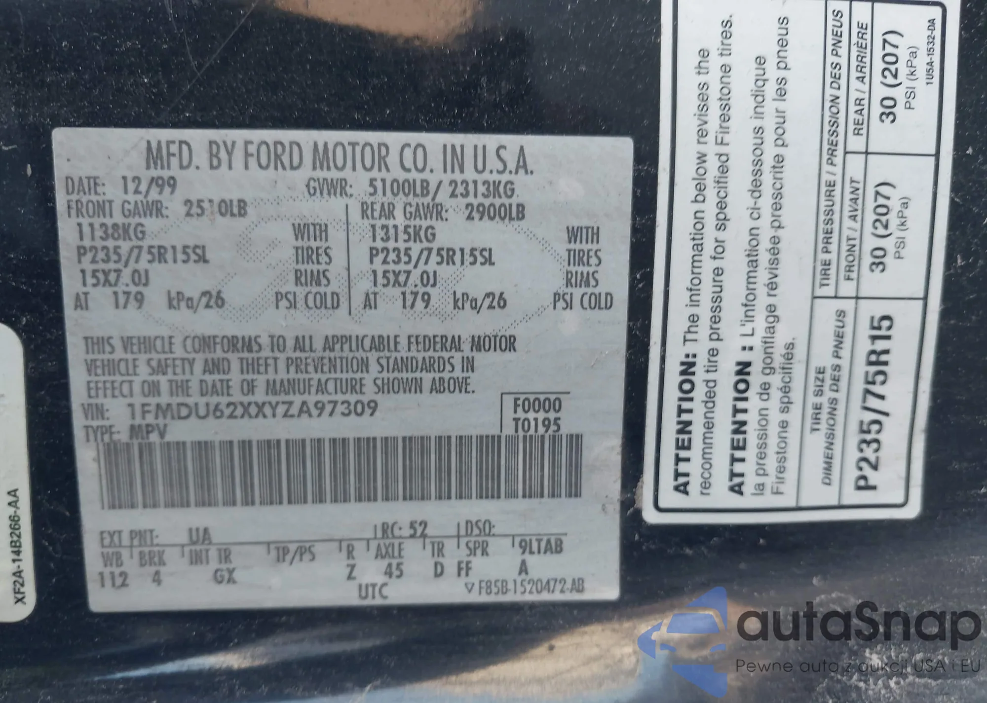 LOT: 43137281 VIN: 1FMDU62XXYZA97309